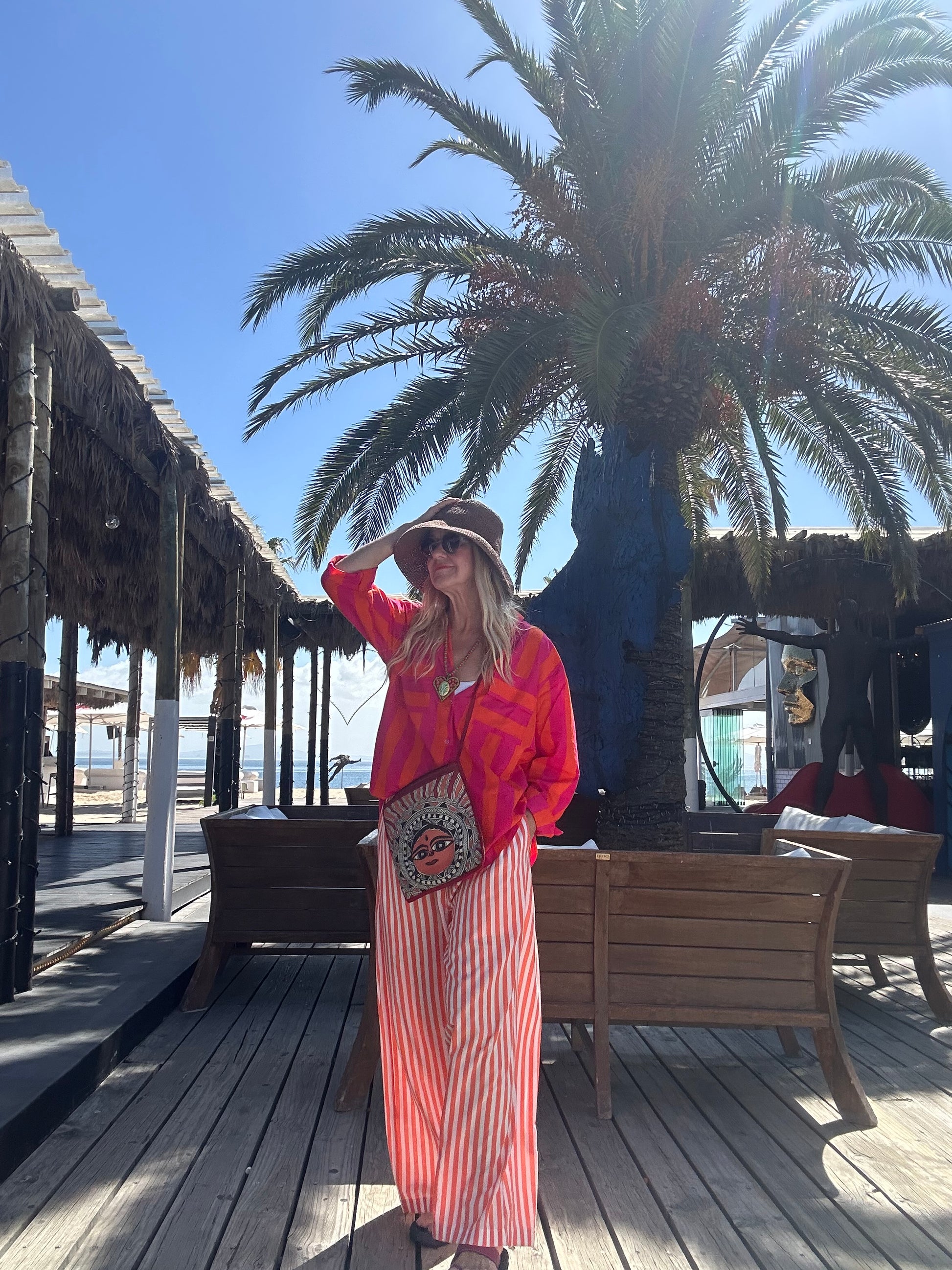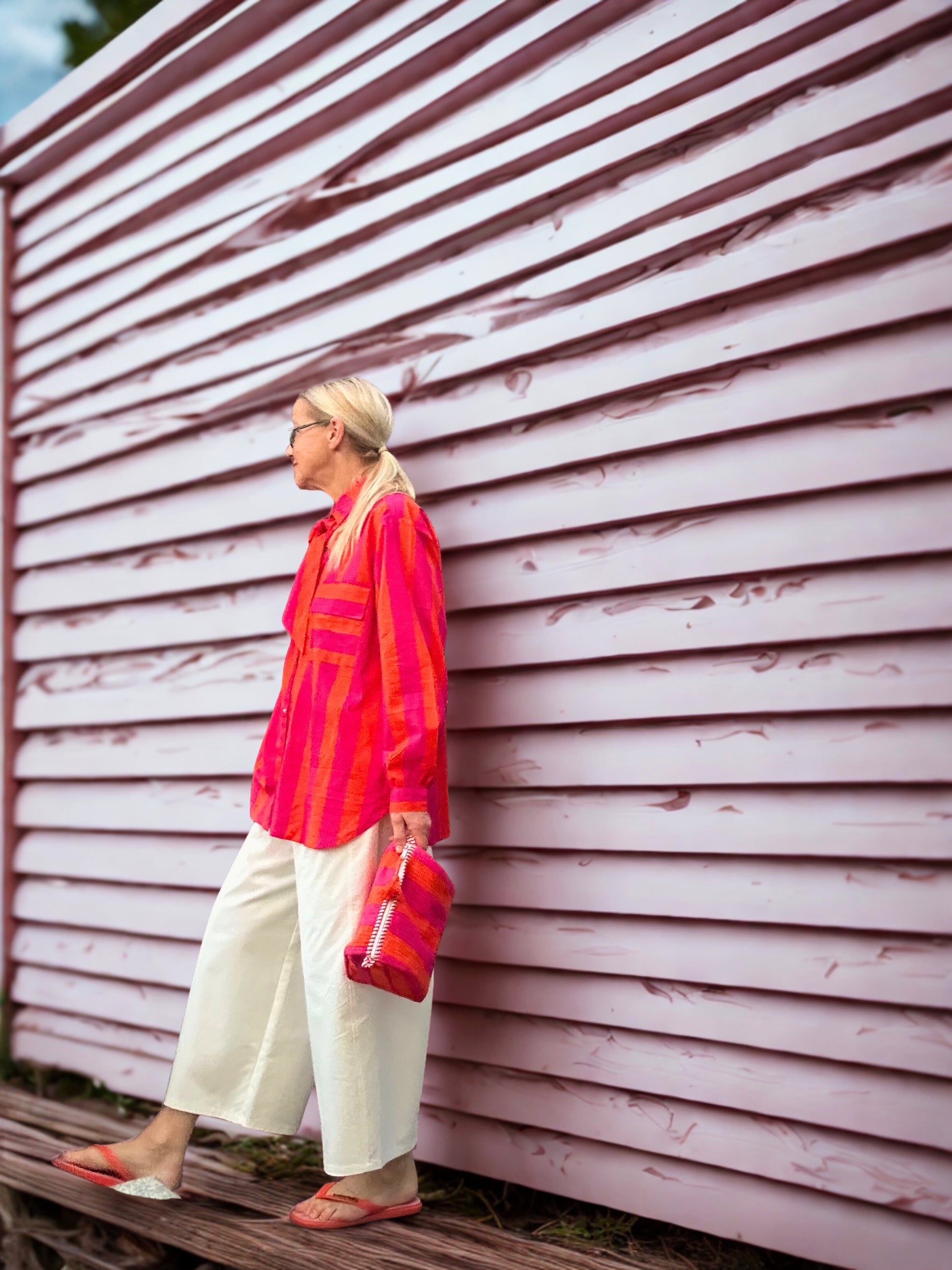 Die Bluse in leuchtendem Pink und Orange bietet eine auffällige Farbgebung, die sowohl visuelle Attraktivität als auch Vielseitigkeit im Stil gewährleistet. Die kräftigen Farben können leicht mit verschiedenen Outfits kombiniert werden, wodurch sie sich optimal für verschiedene Anlässe eignet.Die gekämmte Baumwolle macht sie zu einem idealen Kleidungsstück sowohl im Sommer als auch im Winter.