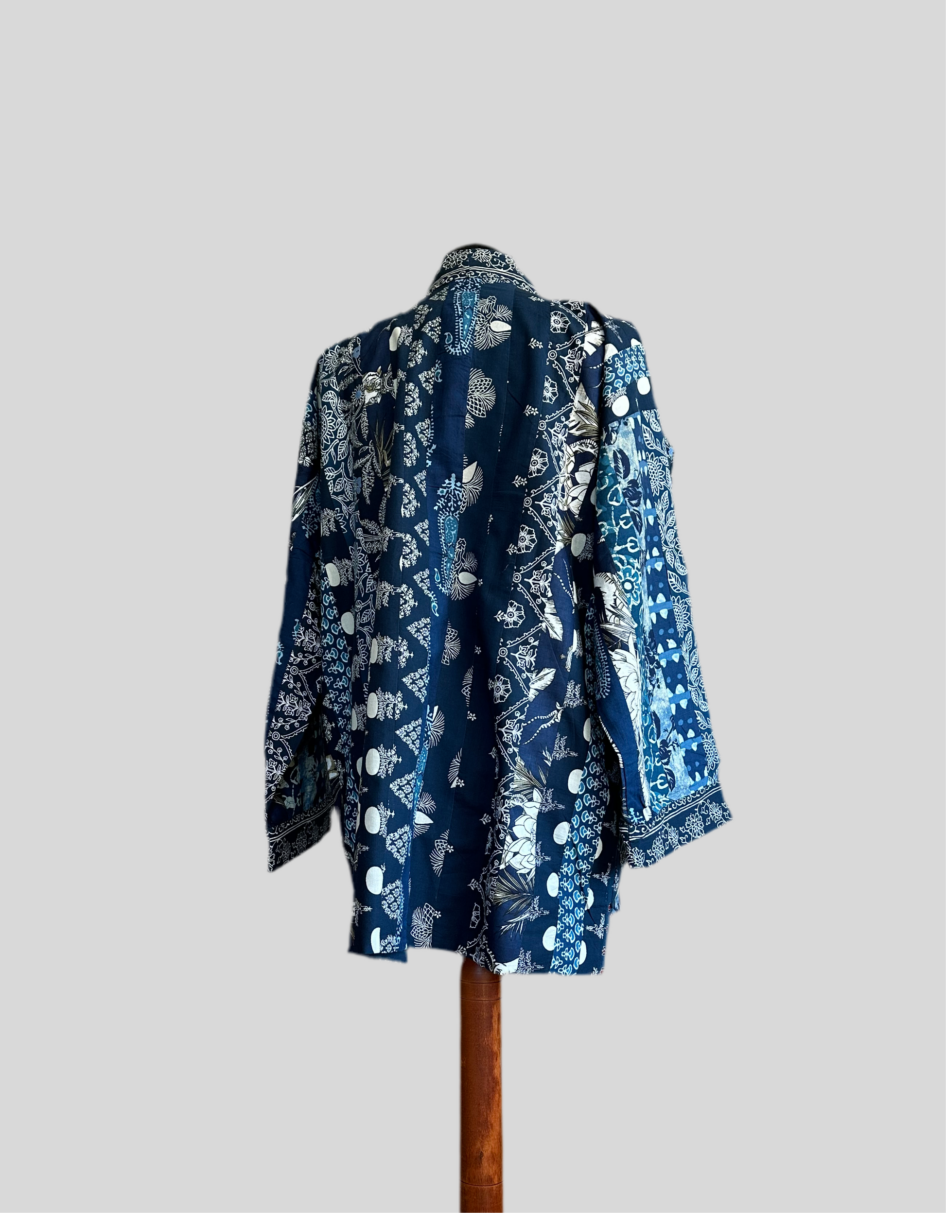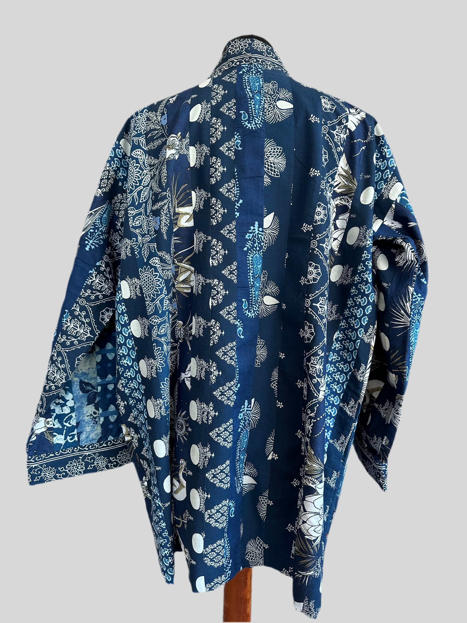 Diese Kimonojacke aus 100 % Baumwolle ist ein perfektes Zusammenspiel von Komfort, Tradition und Vielseitigkeit. Das elegante indische Muster auf einem strahlenden Blauton verleiht der Jacke einen Hauch von Exotik und Kultur. Dank ihrer 2 wendbaren Seiten können Sie zwischen einer gemusterten und einer schlichten Variante wählen – ideal für unterschiedliche Anlässe und Stimmungen.