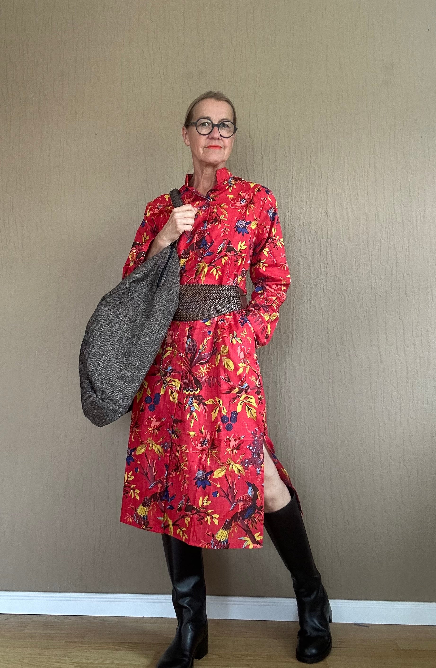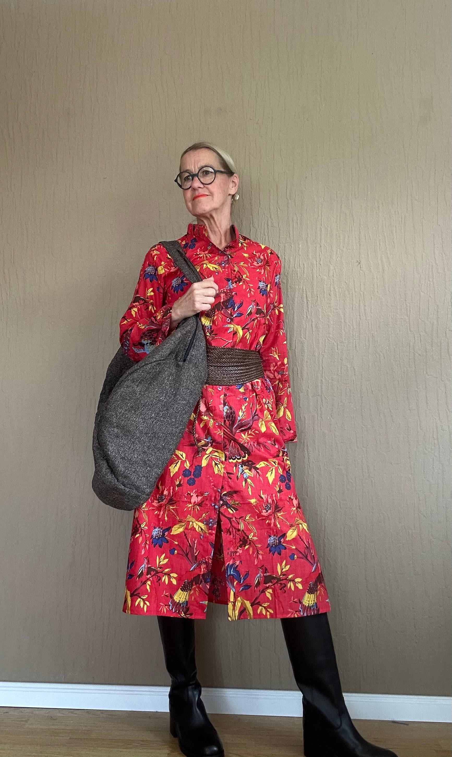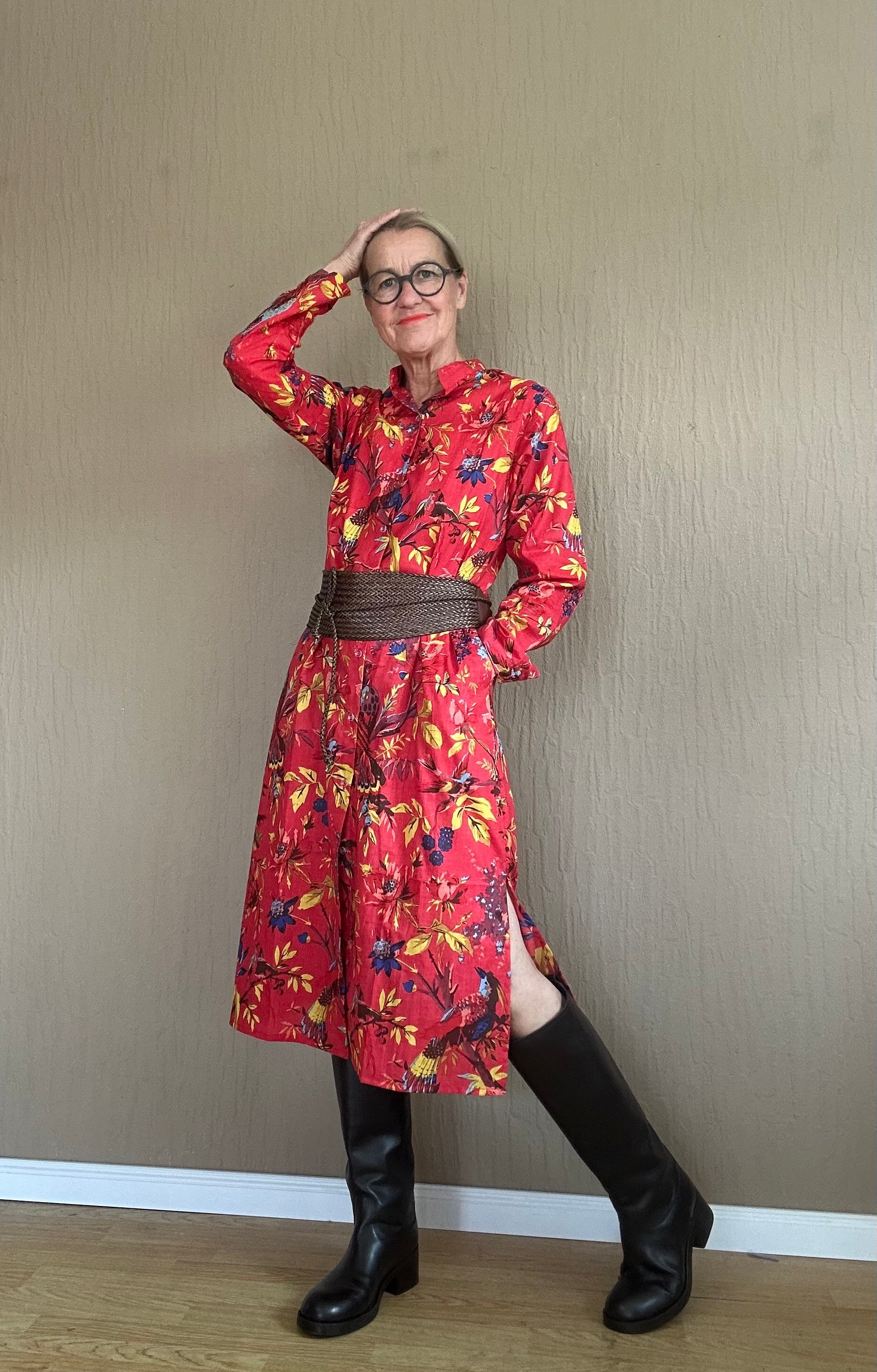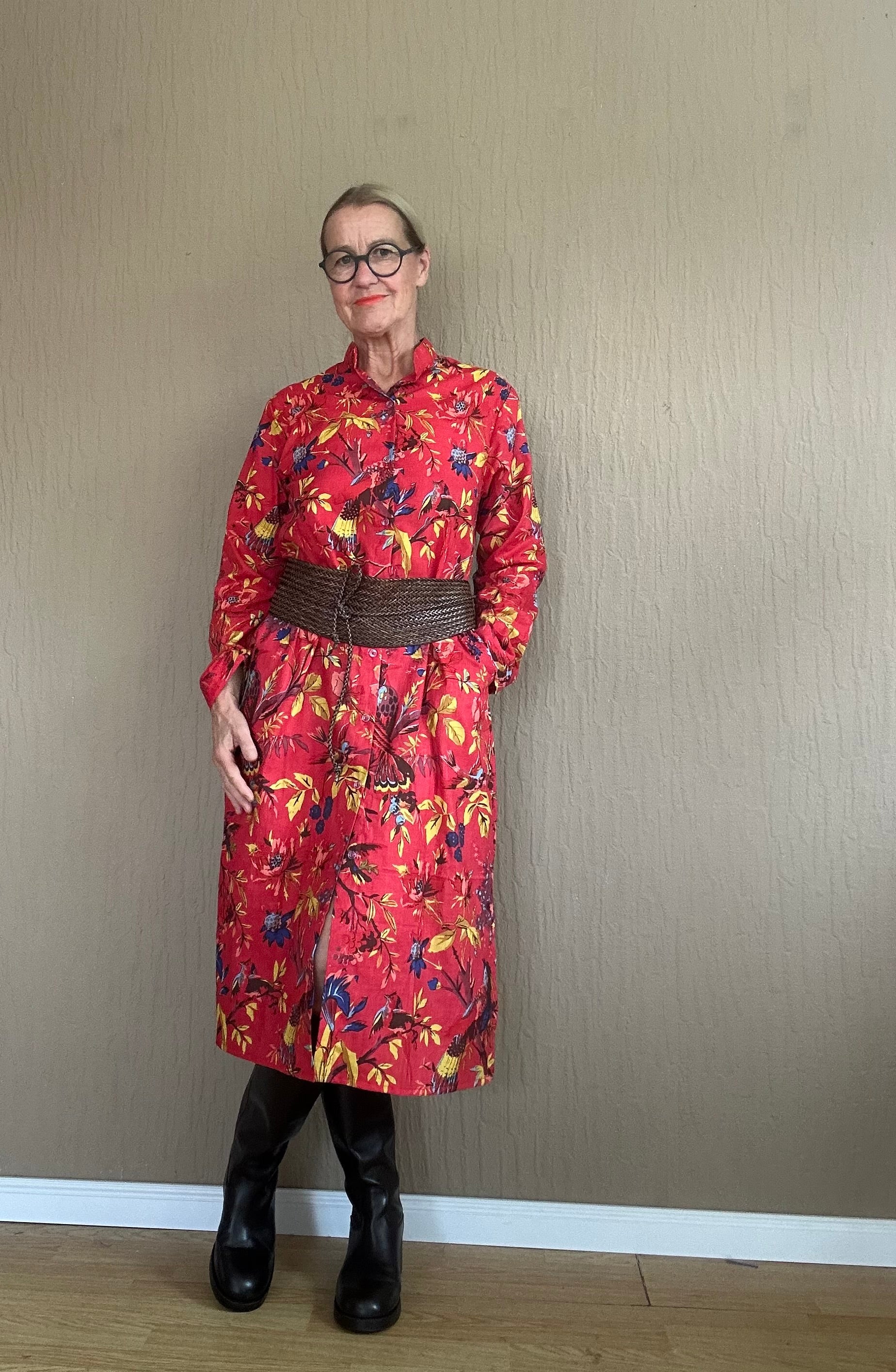 Dieses exotische Hemdblusenkleid in leuchtendem Rot ist durchgeknöpft und besticht durch sein auffälliges Muster. Perfekt für einen strahlenden Look, der zugleich frisch und modisch wirkt. Mit diesem Kleid ziehen Sie alle Blicke auf sich und bringen Farbe in Ihren Kleiderschrank.