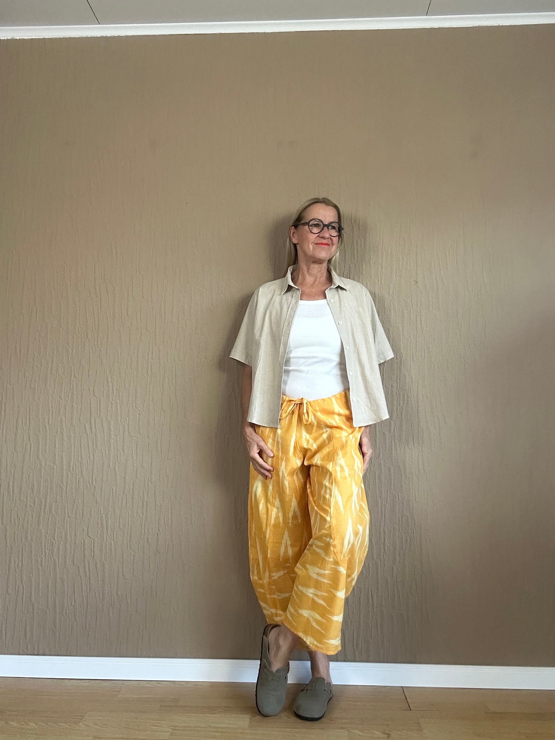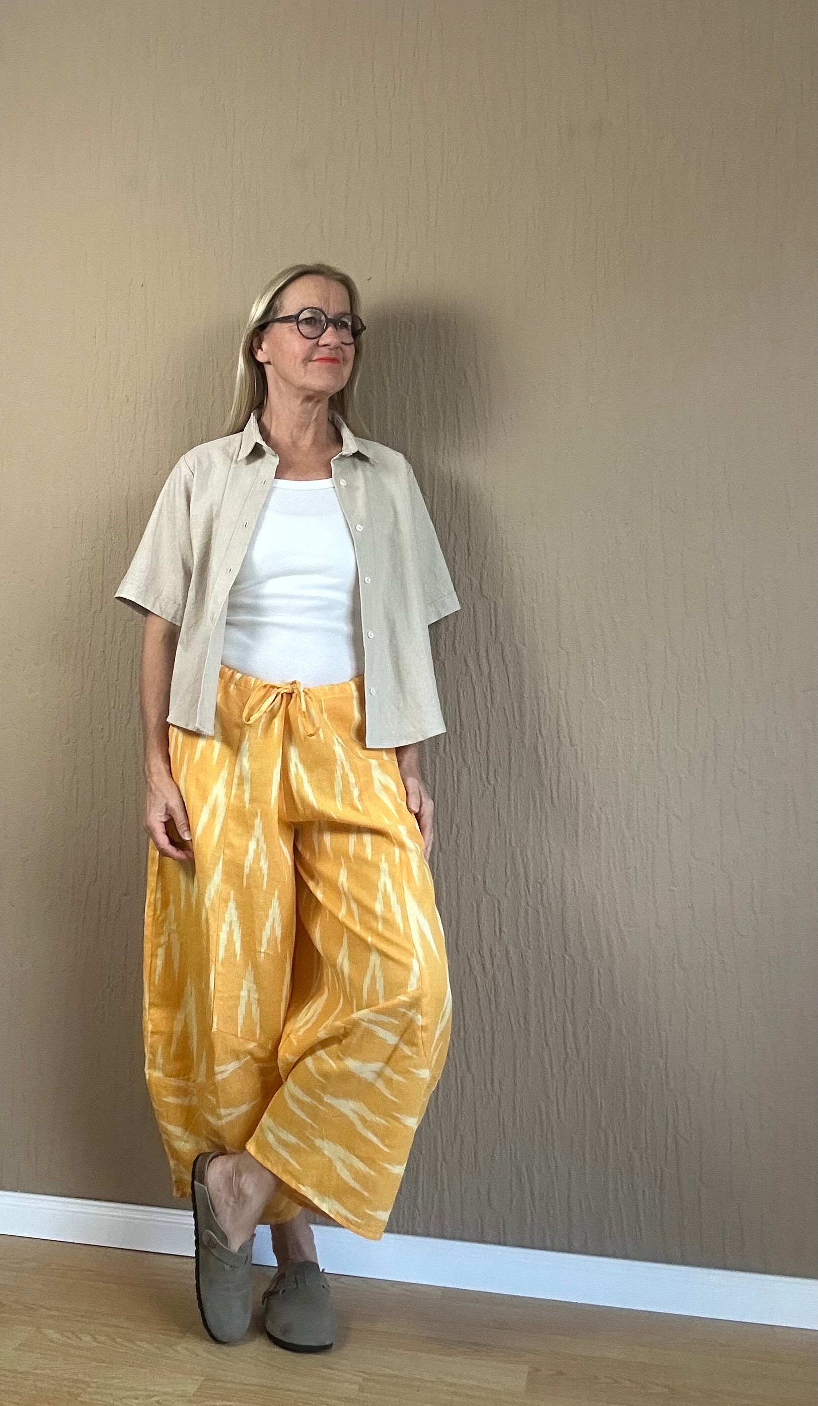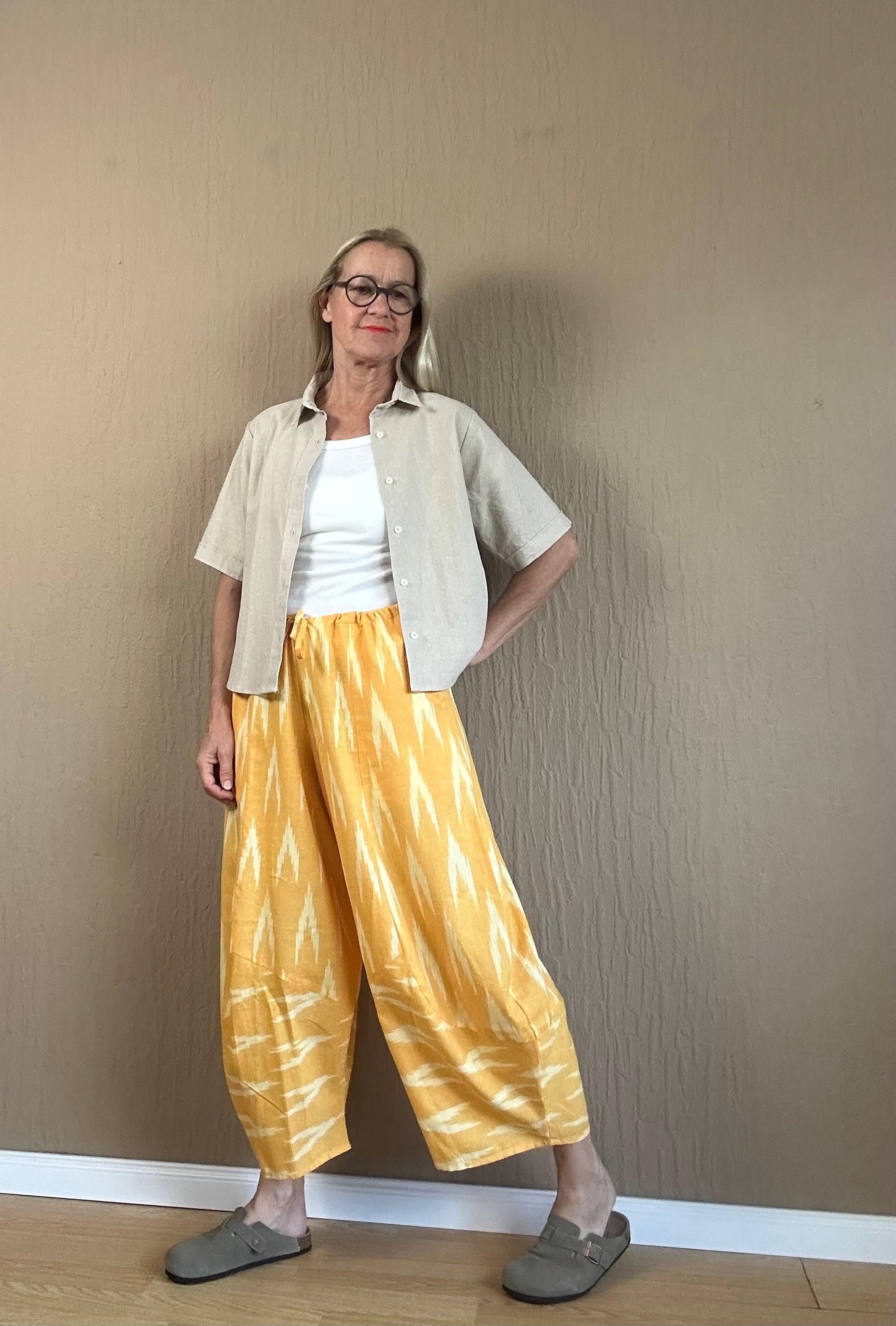 Die Sonnengelb Hose aus einer weichen Baumwolle/Leinen Mischung bietet Ihnen nicht nur ein hochwertiges Tragegefühl, sondern auch eine lockere Passform für absolute Bewegungsfreiheit. Mit dem Tunnelzug können Sie die Hose individuell anpassen. Perfekt für einen lässigen und bequemen Look.