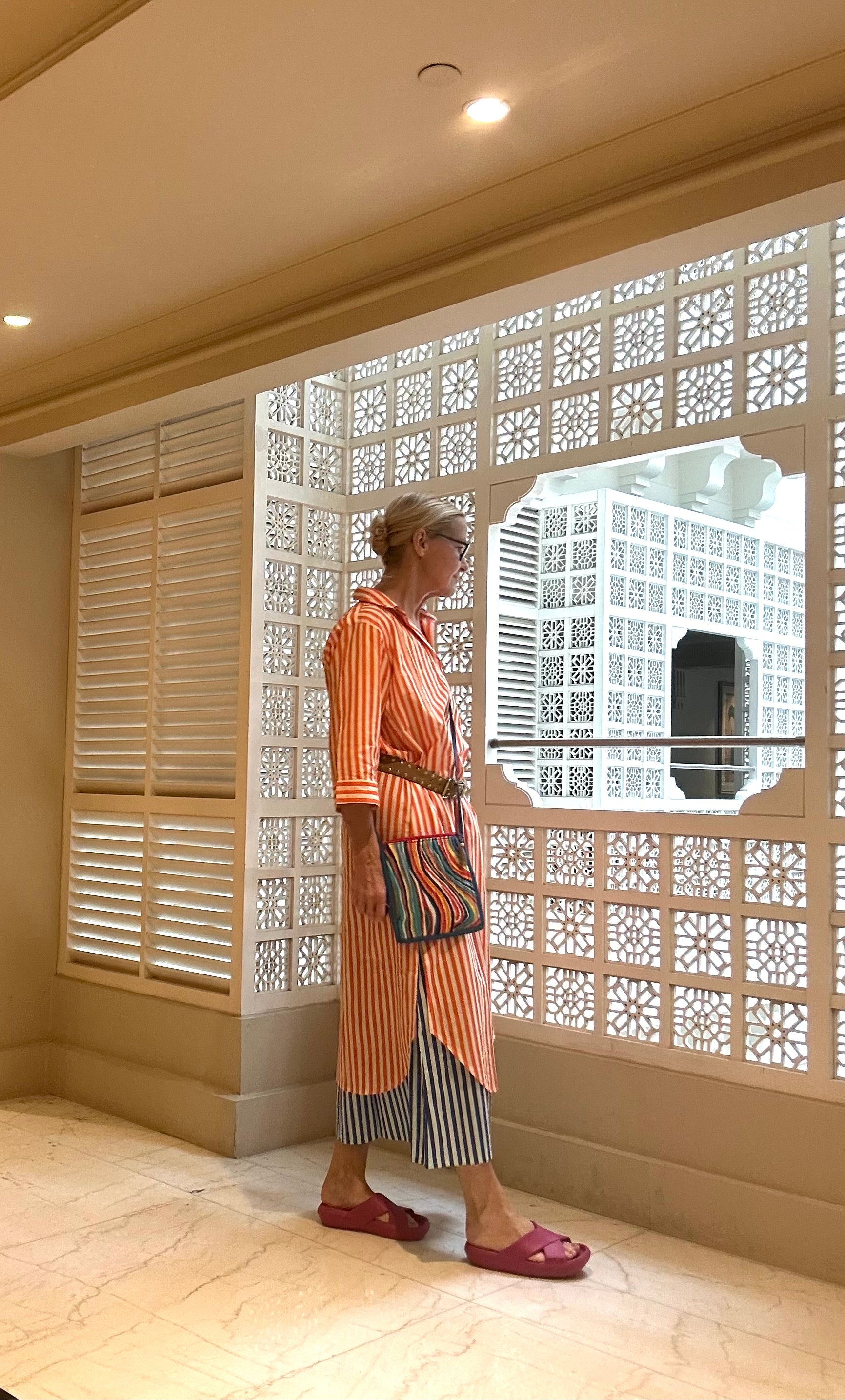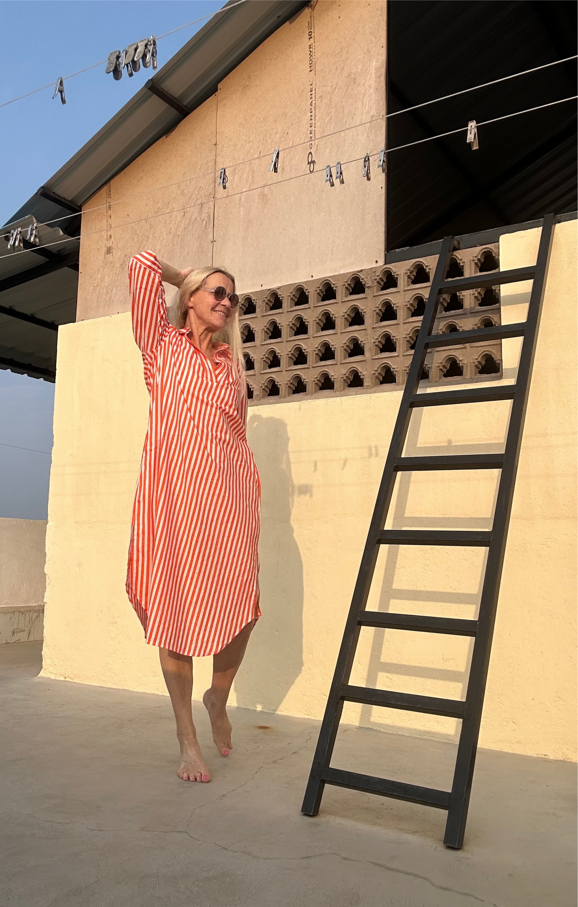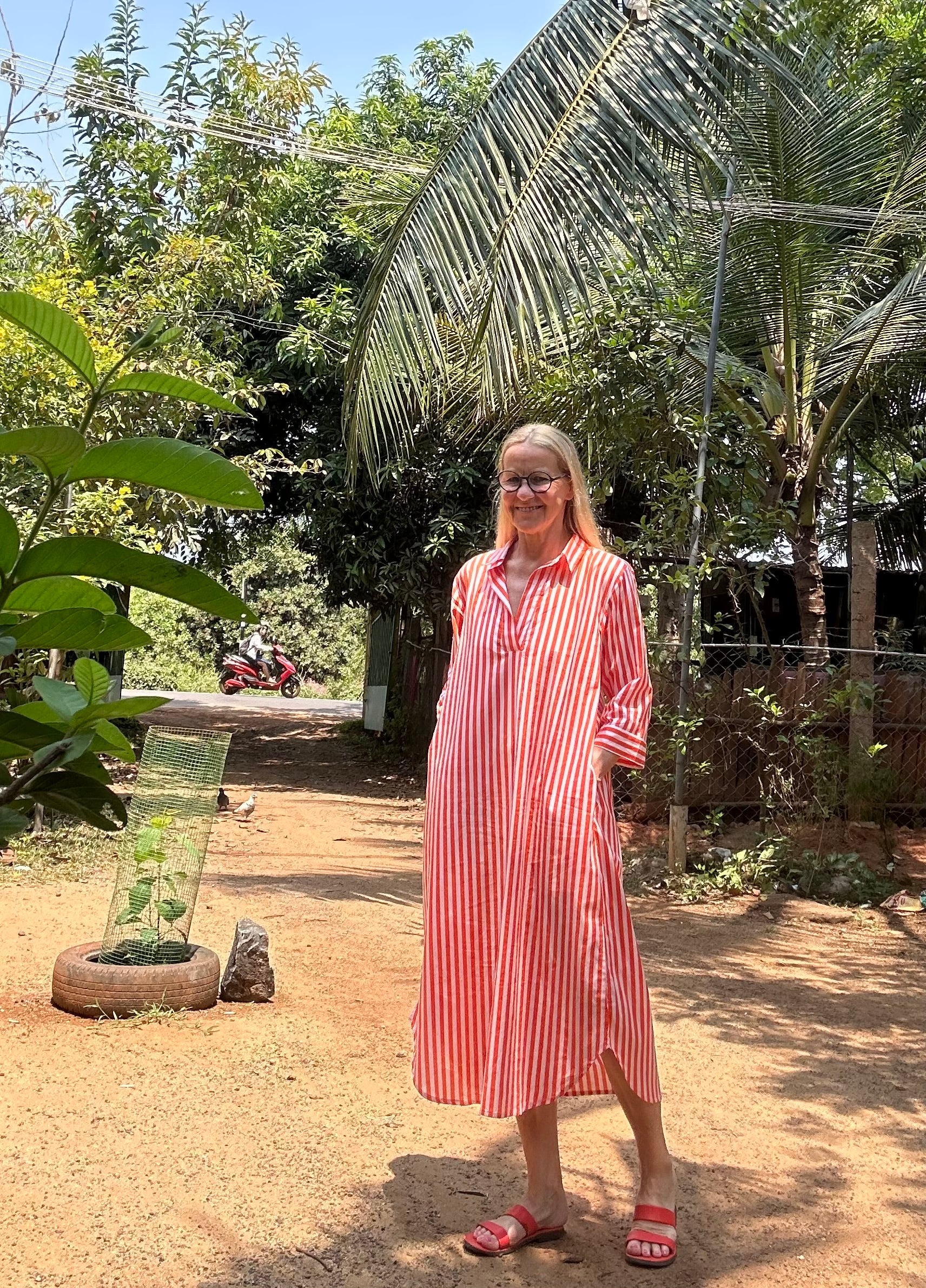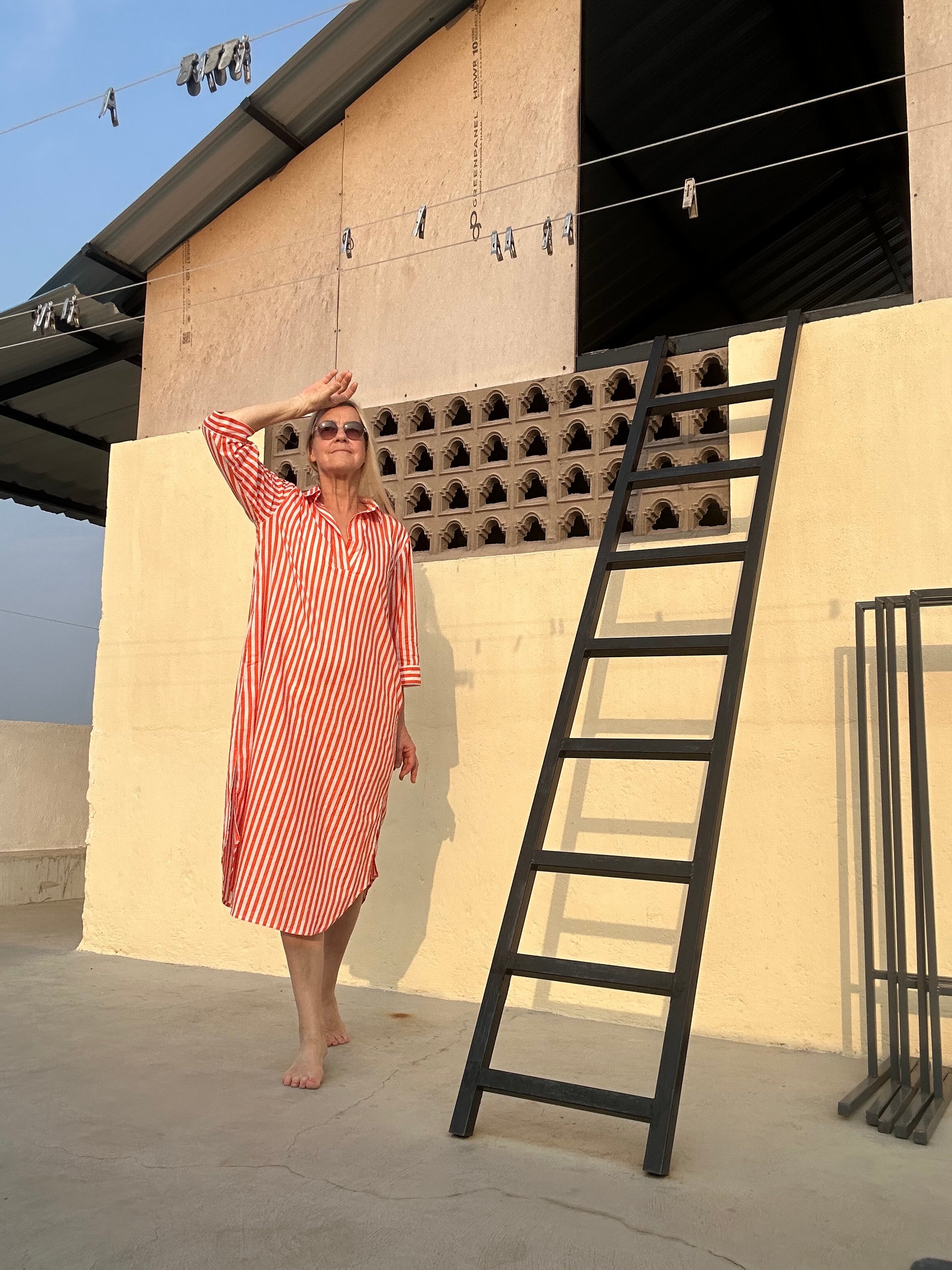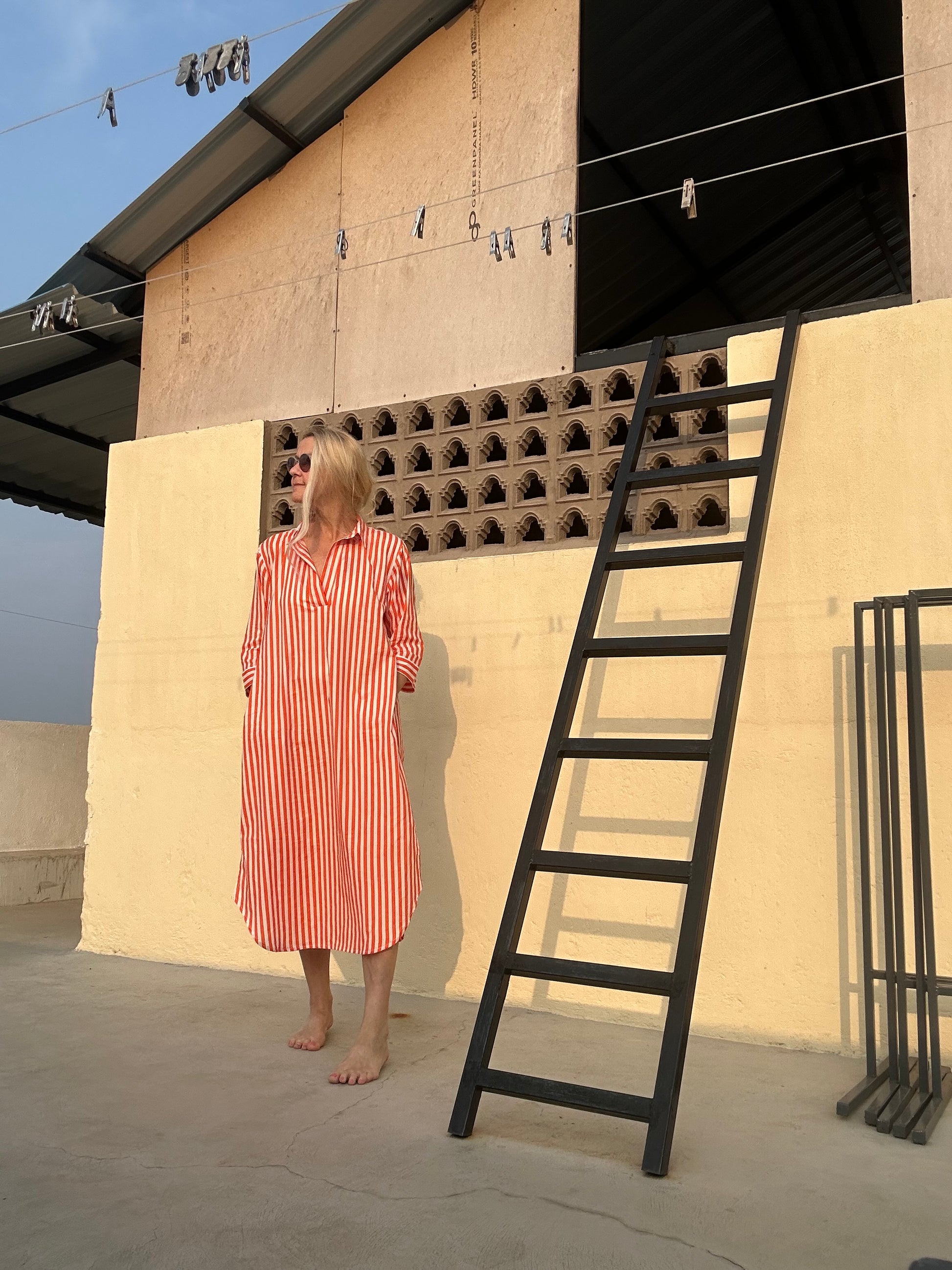Holen Sie sich diesen Sommer mit dem Kaftan in Orange und weißem Streifenmuster einen Hauch von Frische. Mit praktischen Eingrifftaschen kann er lässig über einer Hose getragen werden oder dient als stilvoller Überwurf am Strand oder Pool. Perfekt für einen entspannten Tag unter der Sonne.