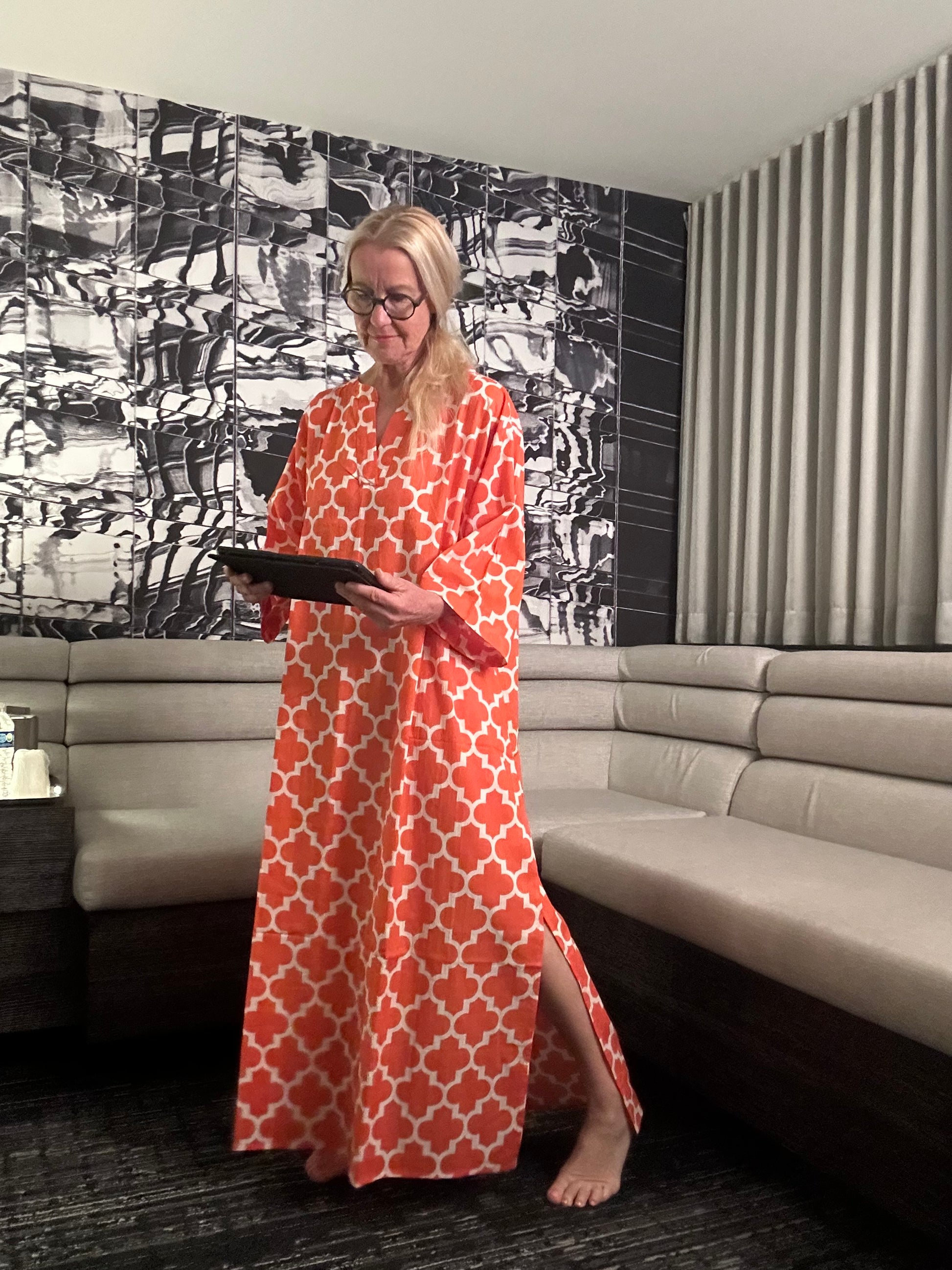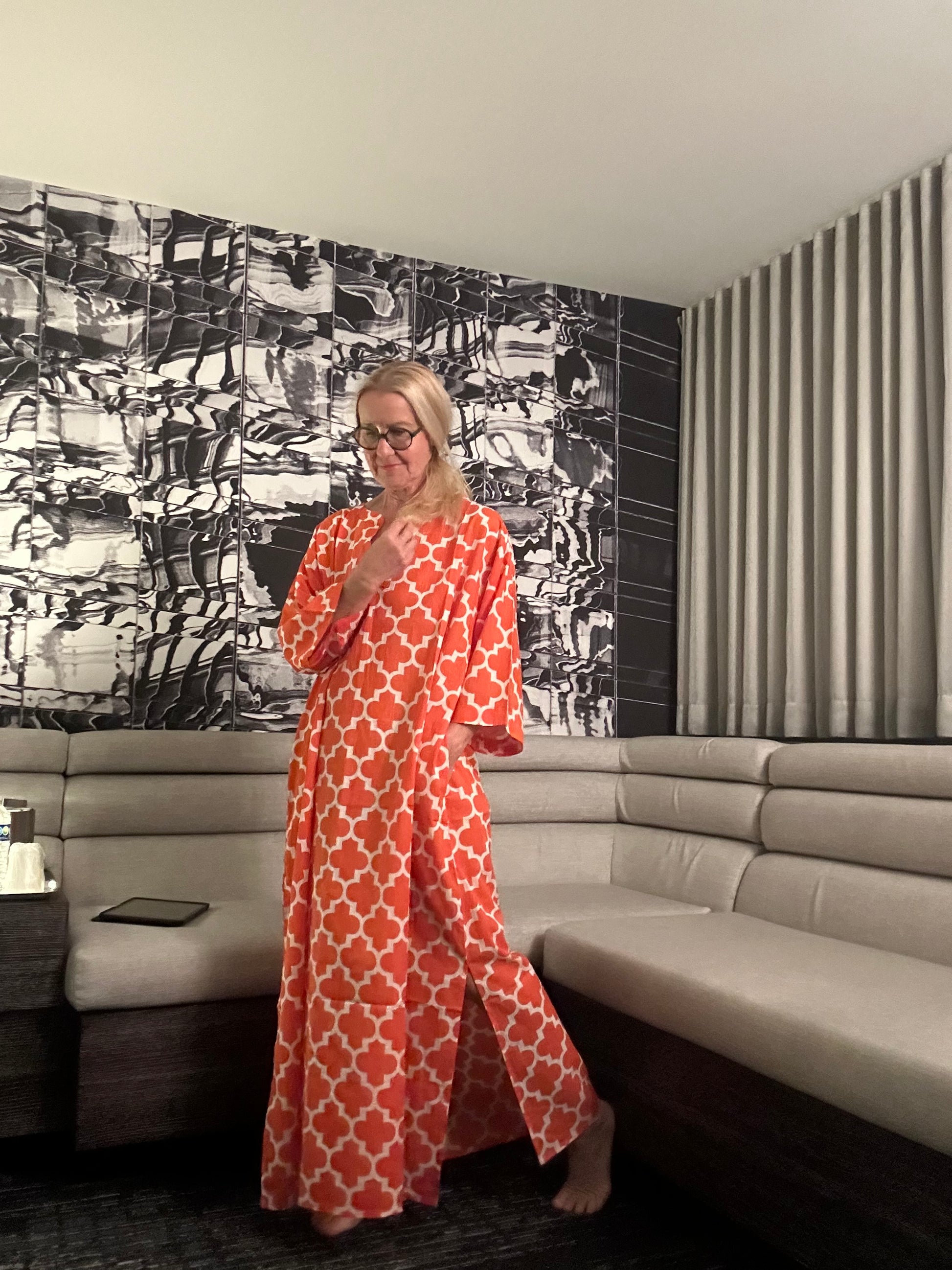 Der Kaftan im orange 🍊 graphischen Muster ist ein begehrtes Kleidungsstück, das bereits bei seiner Veröffentlichung schnell ausverkauft war. Jetzt ist er wieder da. Nutzen Sie die Chance, diesen trendigen Kaftan zu ergattern und ziehen Sie alle Blicke auf sich.