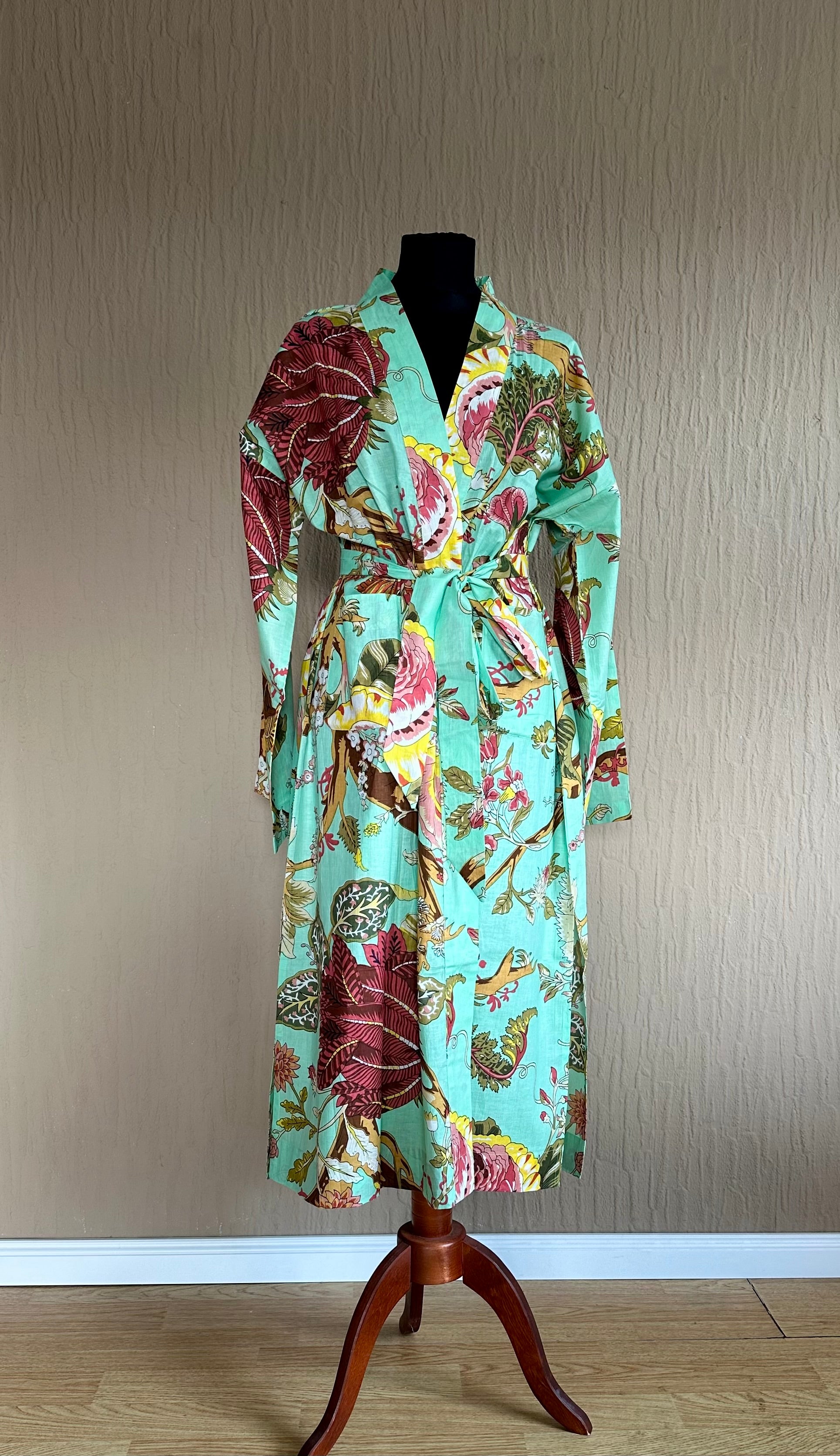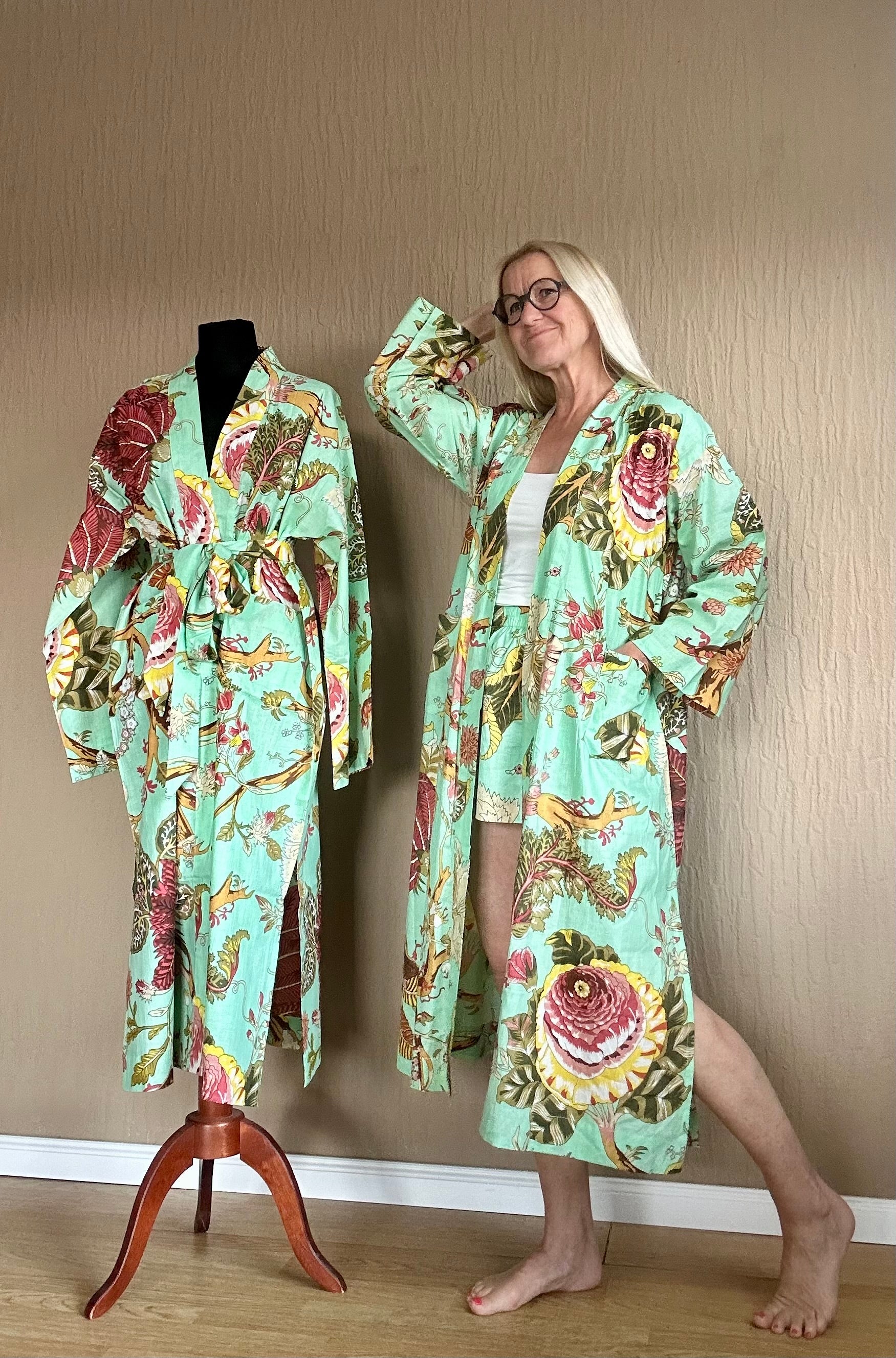 Erleben Sie ein Gefühl von Leichtigkeit und Schönheit mit diesem Kimono in zartem Grün und floralen Druck. Genießen Sie das Frühstück oder entspannen Sie sich mit diesem wunderschönen Kleidungsstück.