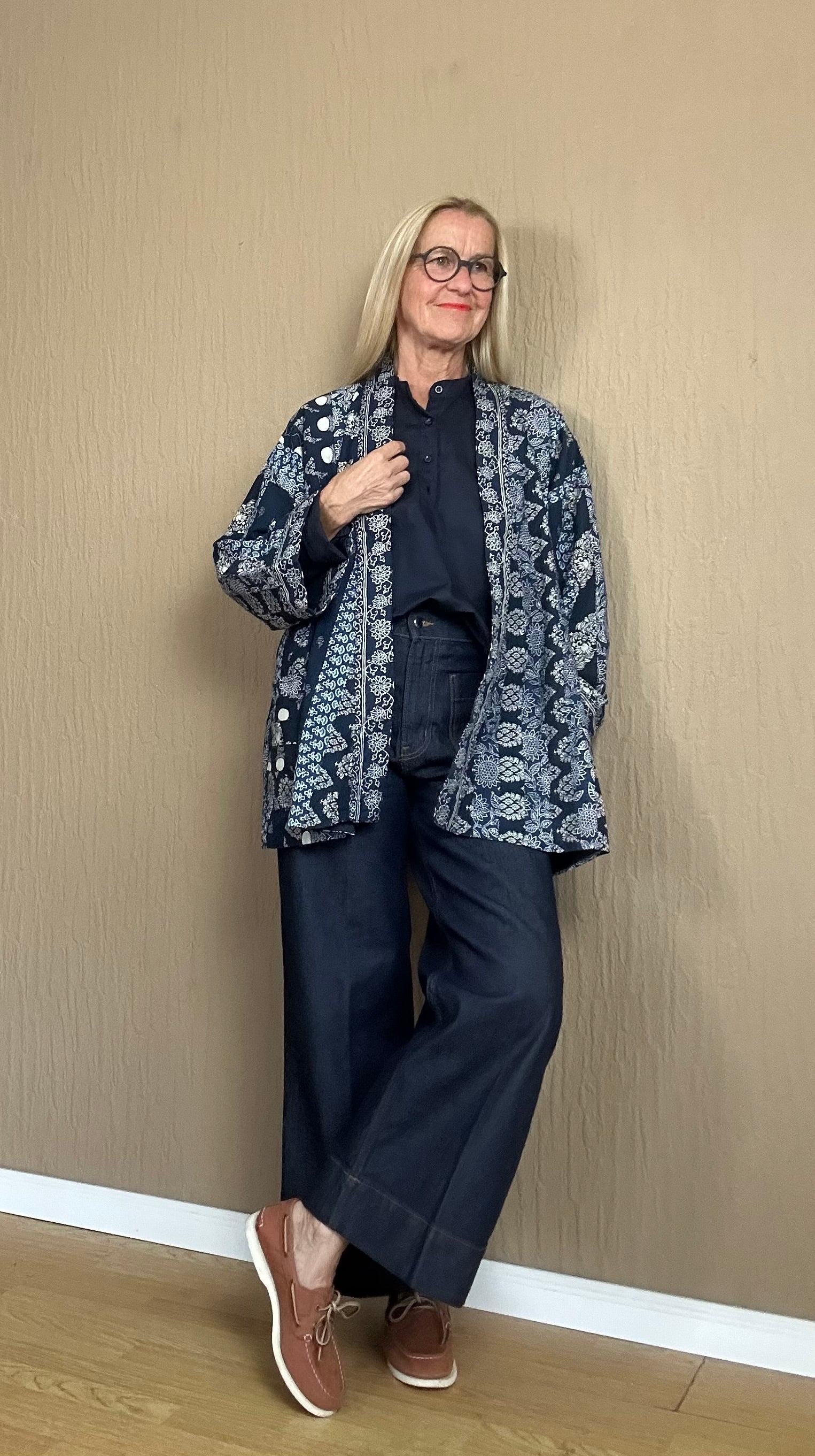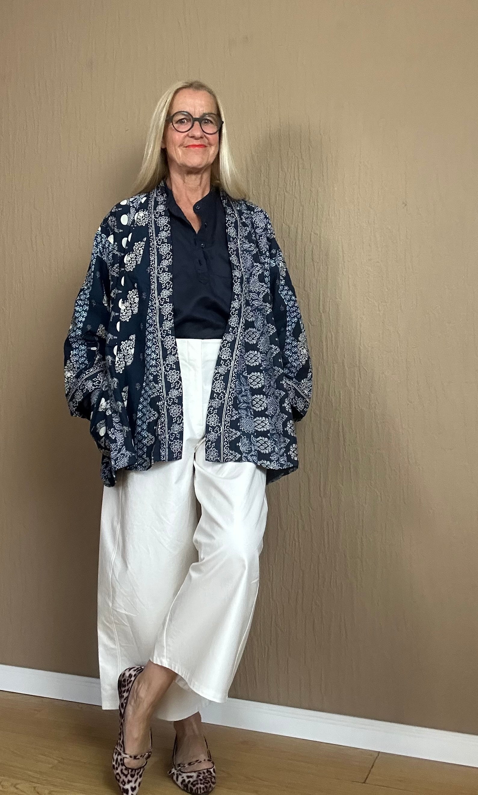 Diese weit geschnittene Kimono Jacke besticht durch ihr einzigartiges Patchwork-Design mit schmalen Streifen und wunderschönen Blau Mustern. Mit der Möglichkeit, die Jacke von beiden Seiten zu tragen - entweder Uni Blau oder Muster - sorgt sie für flexible und vielseitige Outfitoptionen. Perfekt für stilbewusste Damen, die sich von der Masse abheben möchten.