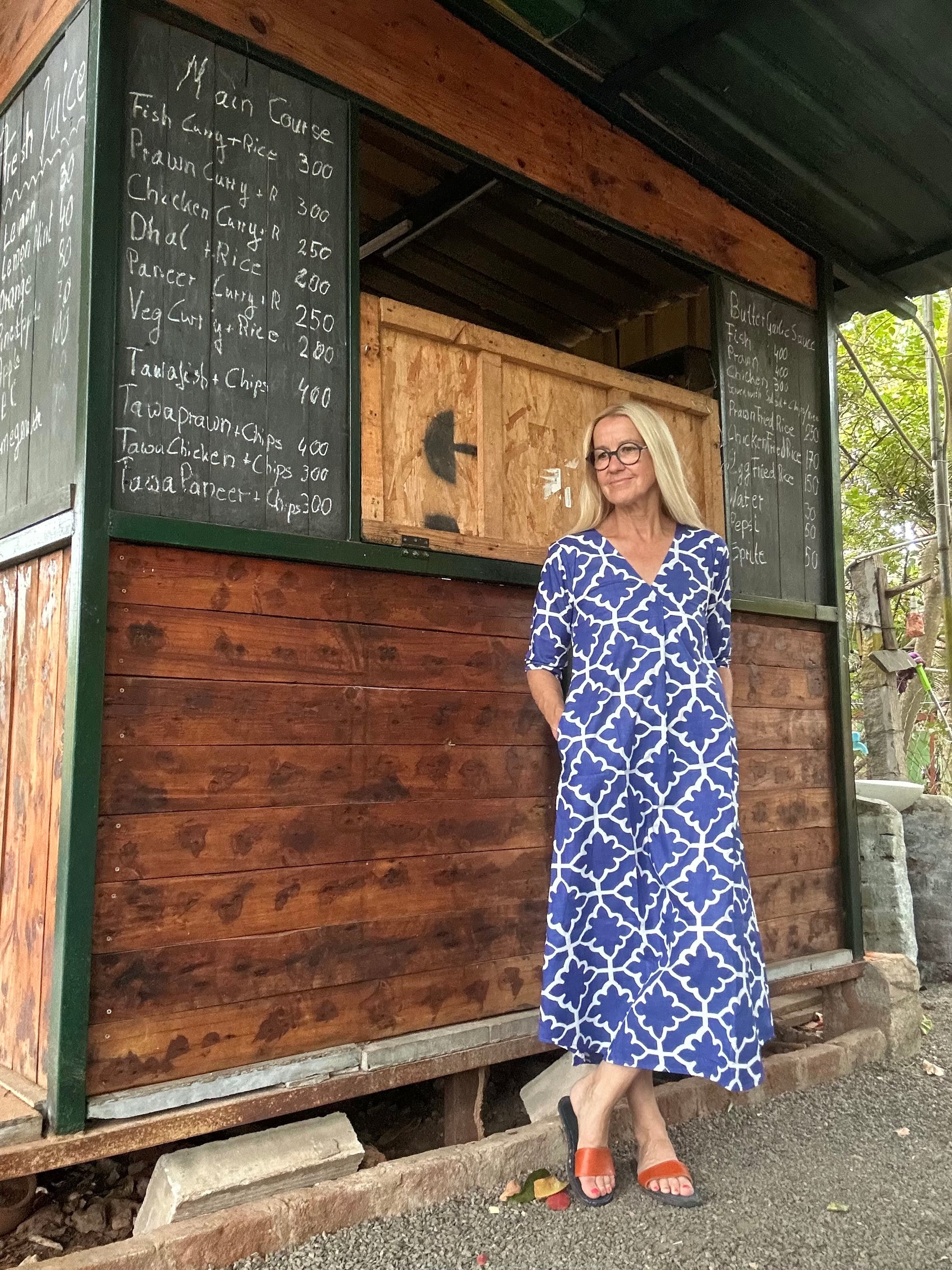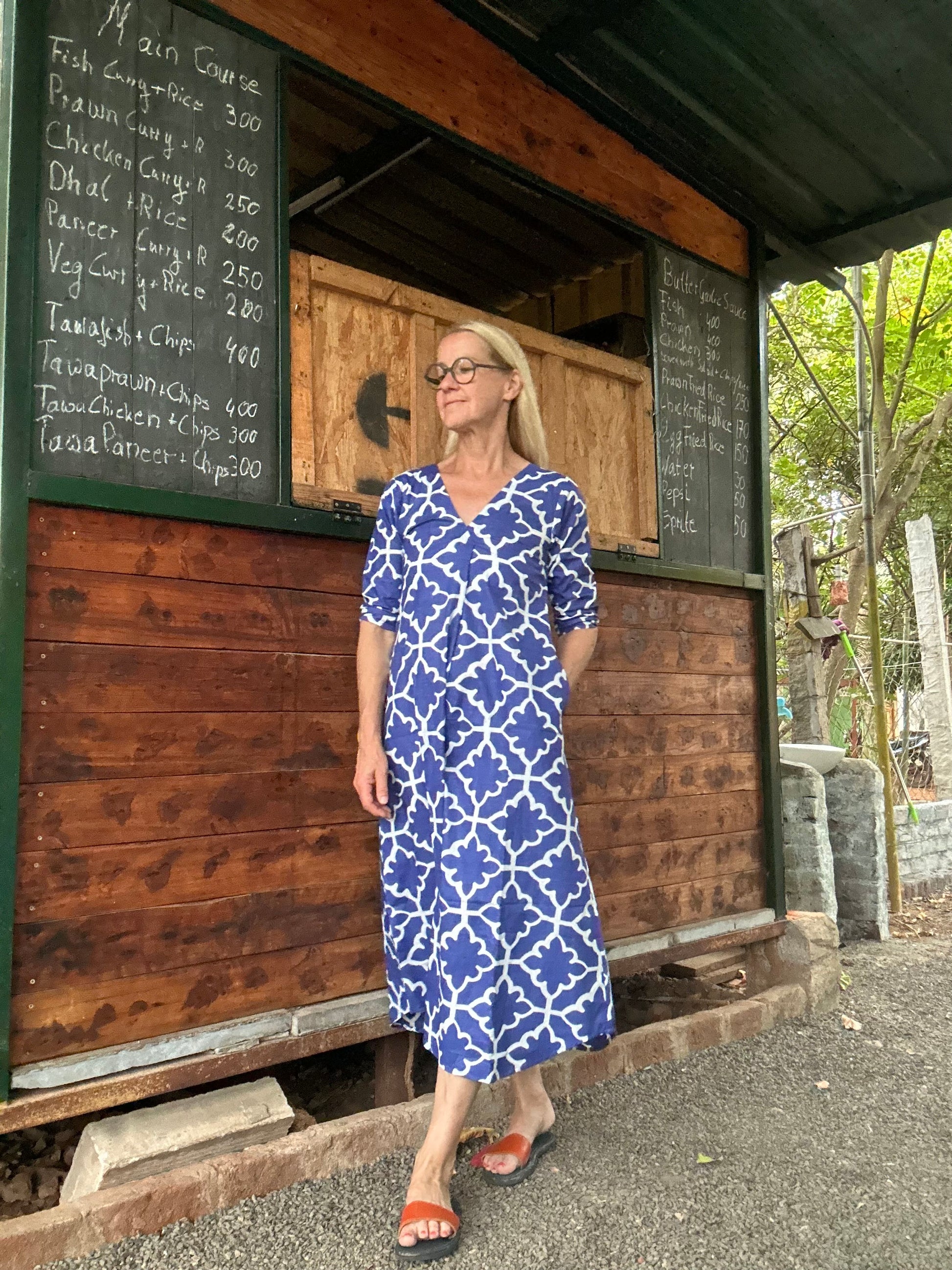 Dieses Kleid mit A Linie Schnitt, hübschem Falten und V Ausschnitt ist der perfekte Begleiter für jeden Anlass. Mit seinem grafischen Muster in tintenblau und praktischen Taschen vereint es Stil und Komfort. Die Falte in der Front sorgt zusätzlich für eine schöne Weite.