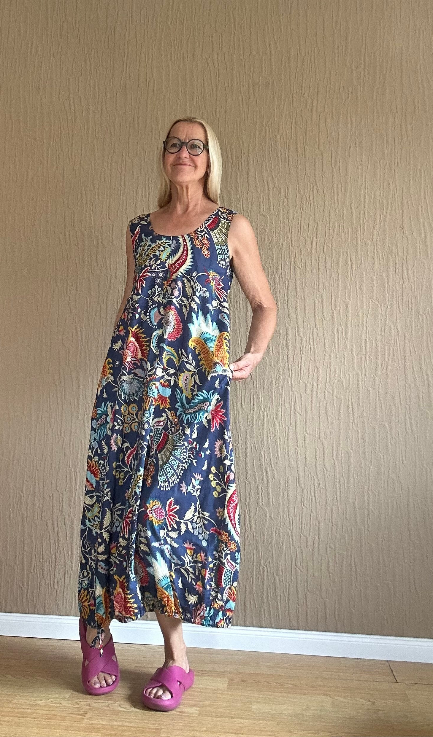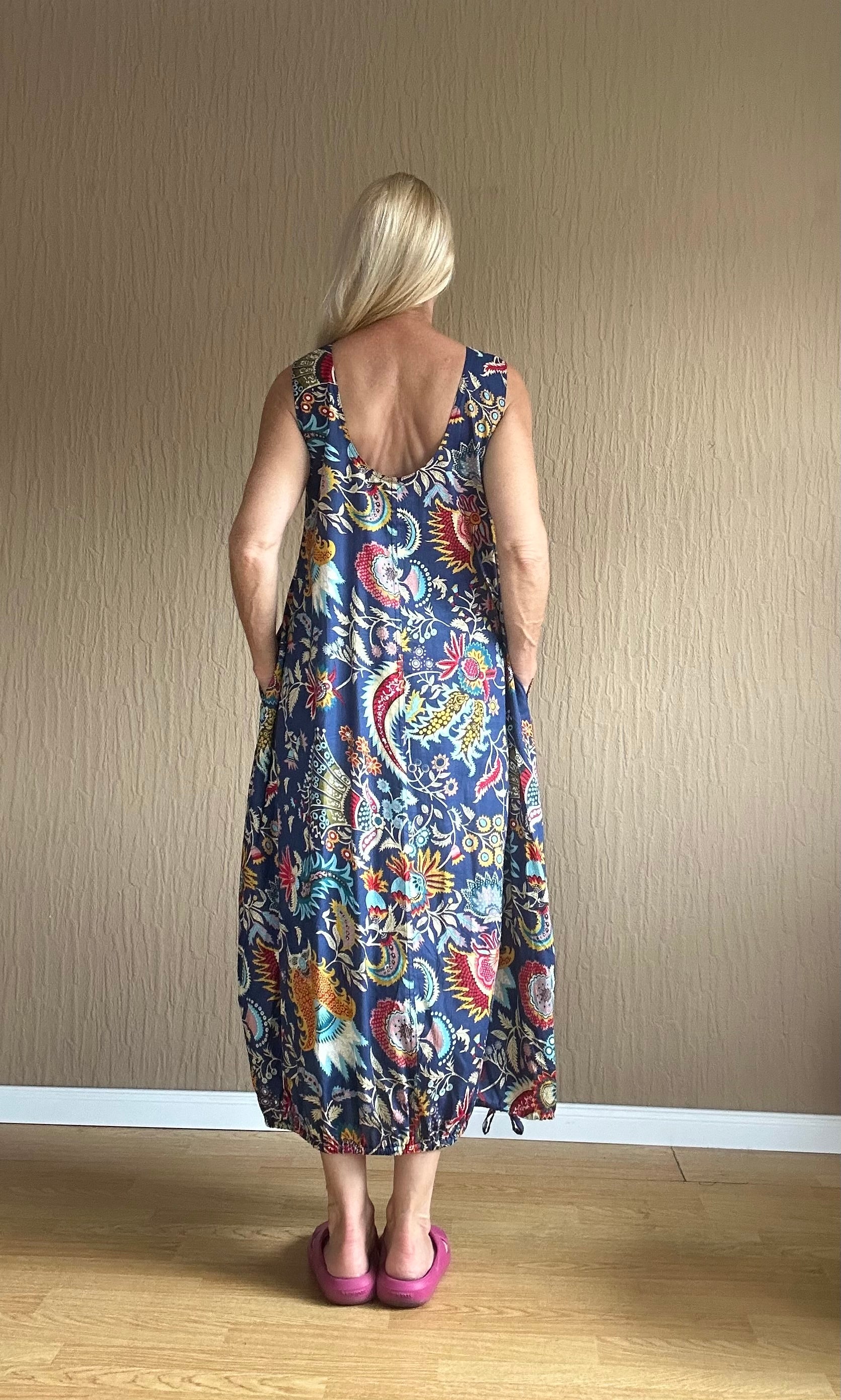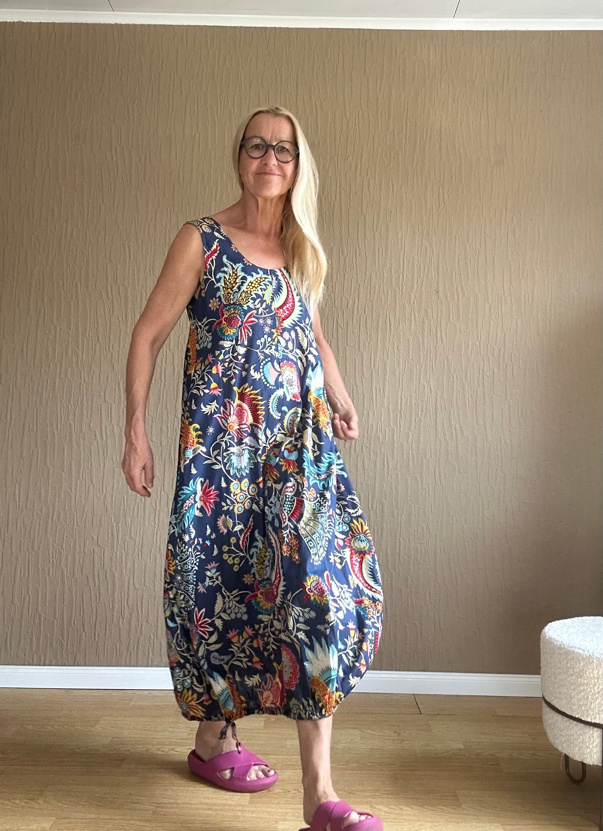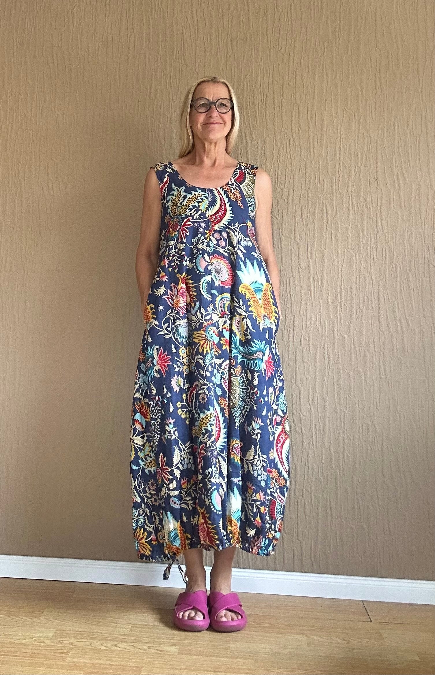 Genießen Sie den Sommer mit unserem fröhlichen Kleid! Das wunderschöne Fantasiemuster in allen Farben verleiht Ihnen einen einzigartigen Look. Der verstellbare Tunnelzug am Saum ermöglicht Ihnen eine individuelle Passform. Perfekt für warme Tage.