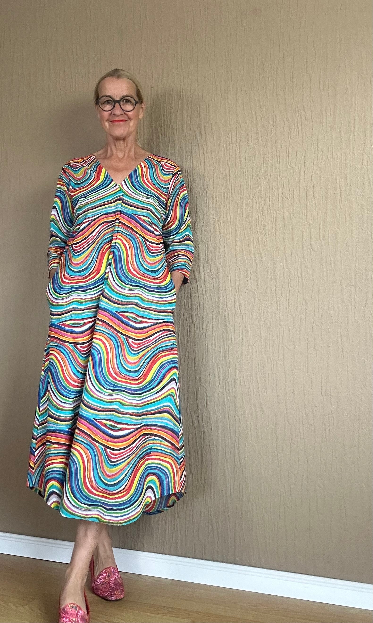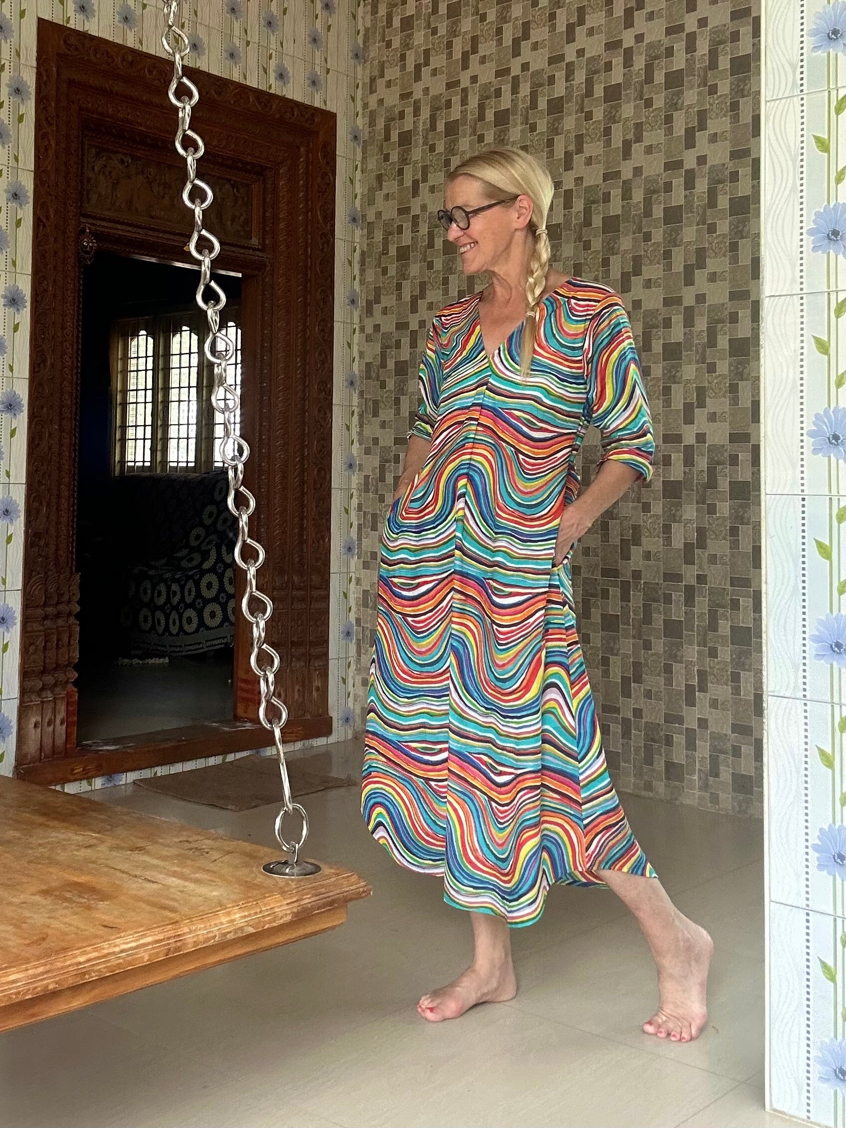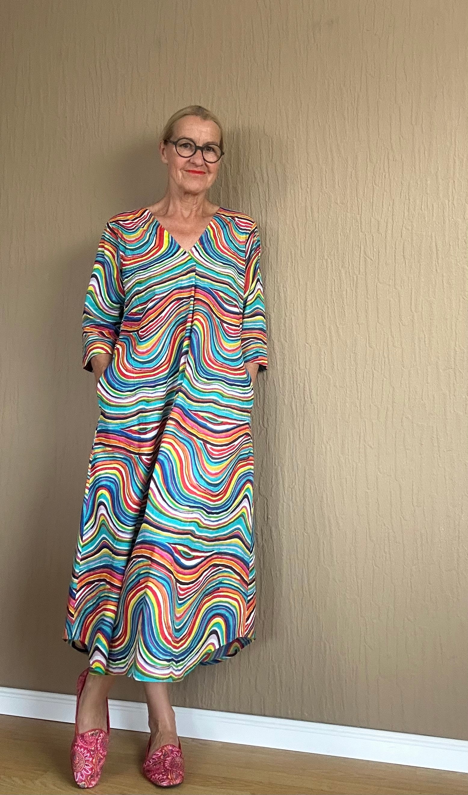 Dieses extravagante Kleid mit Regenbogen-Muster ist ein wahrer Eyecatcher. Der A-Linien-Schnitt sorgt für eine schöne Silhouette und lässt Sie strahlen. Perfekt für besondere Anlässe oder um einfach in der Menge herauszustechen. Mit diesem Kleid werden Sie garantiert alle Blicke auf sich ziehen.