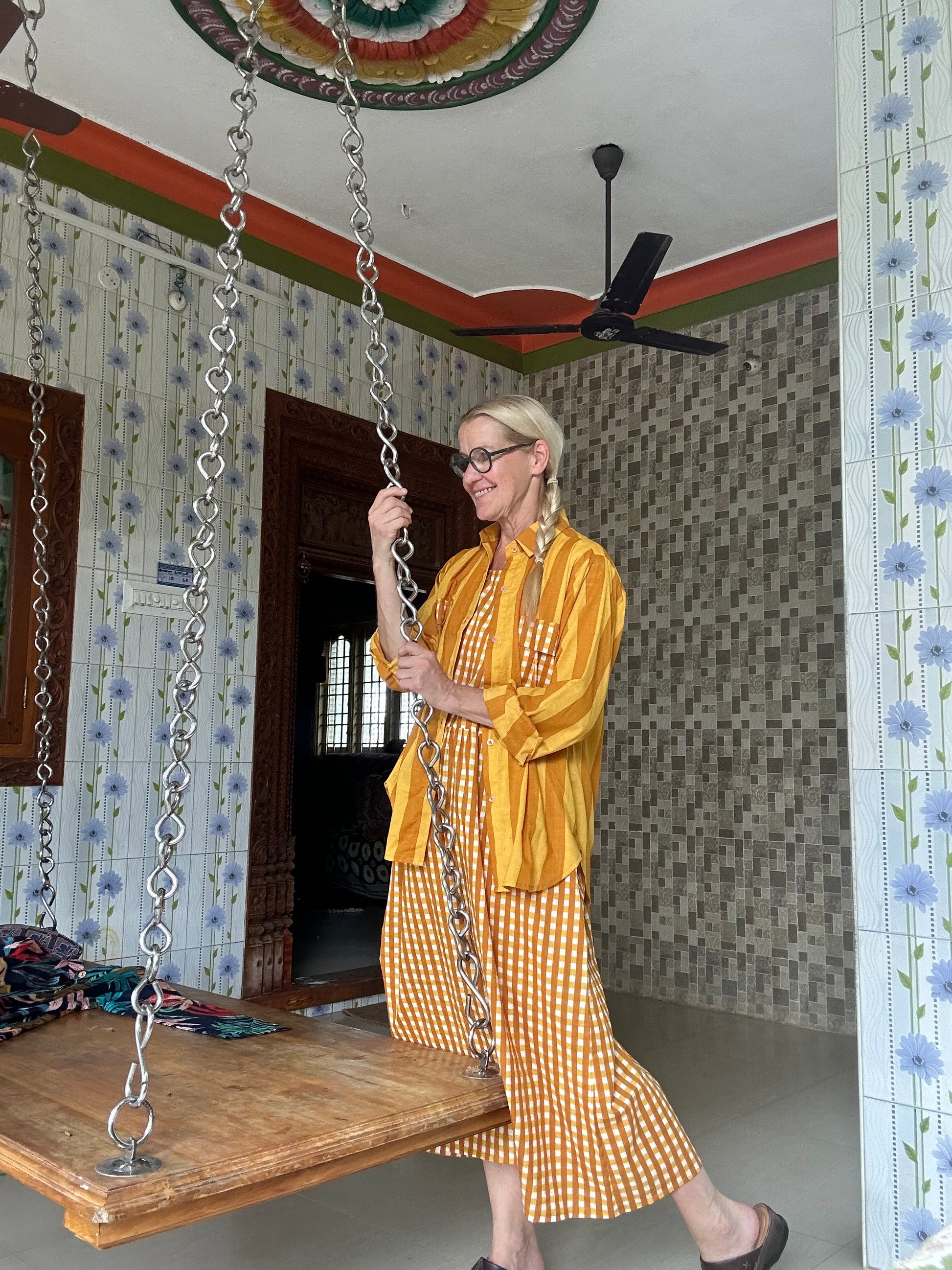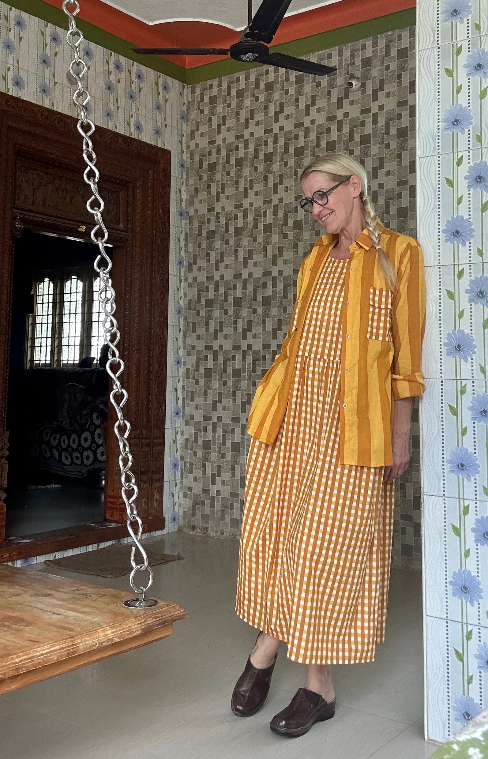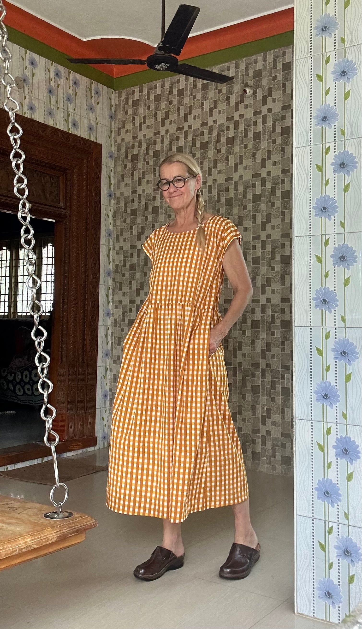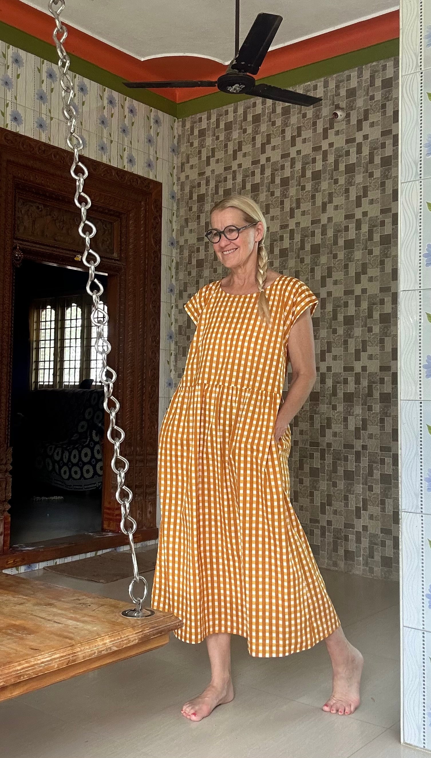 Dieses Kleid ist aus leichter Baumwolle gefertigt und begeistert mit einem angesagten gingham curry gelben Muster. Es ist nicht nur super bequem zu tragen, sondern auch perfekt für den Sommer geeignet. Ein Must-Have für alle Modefans.