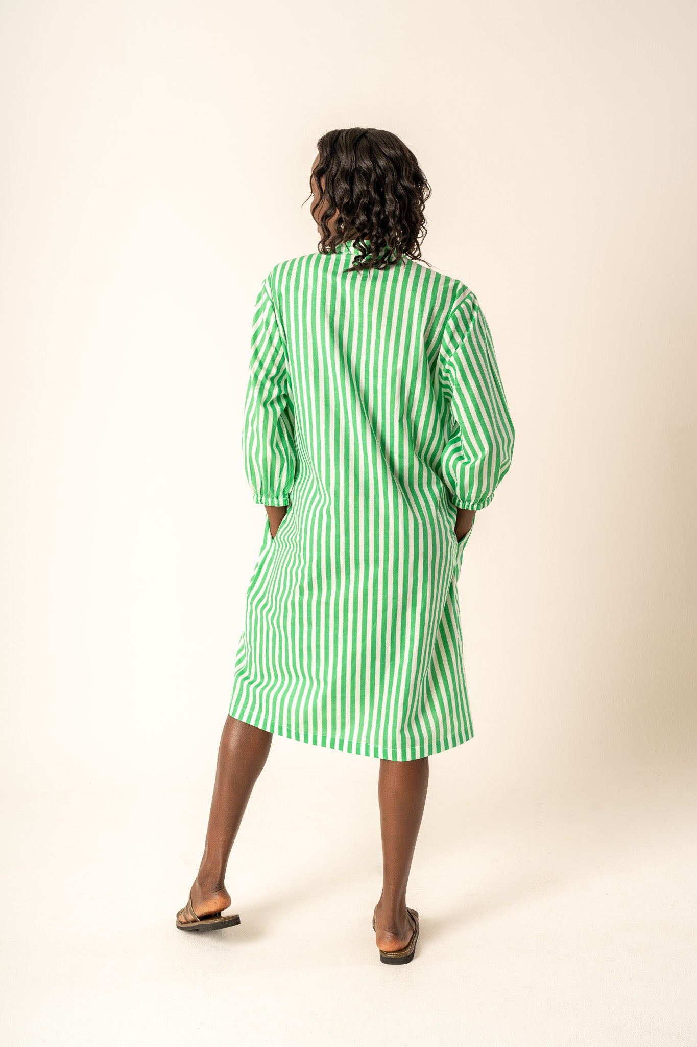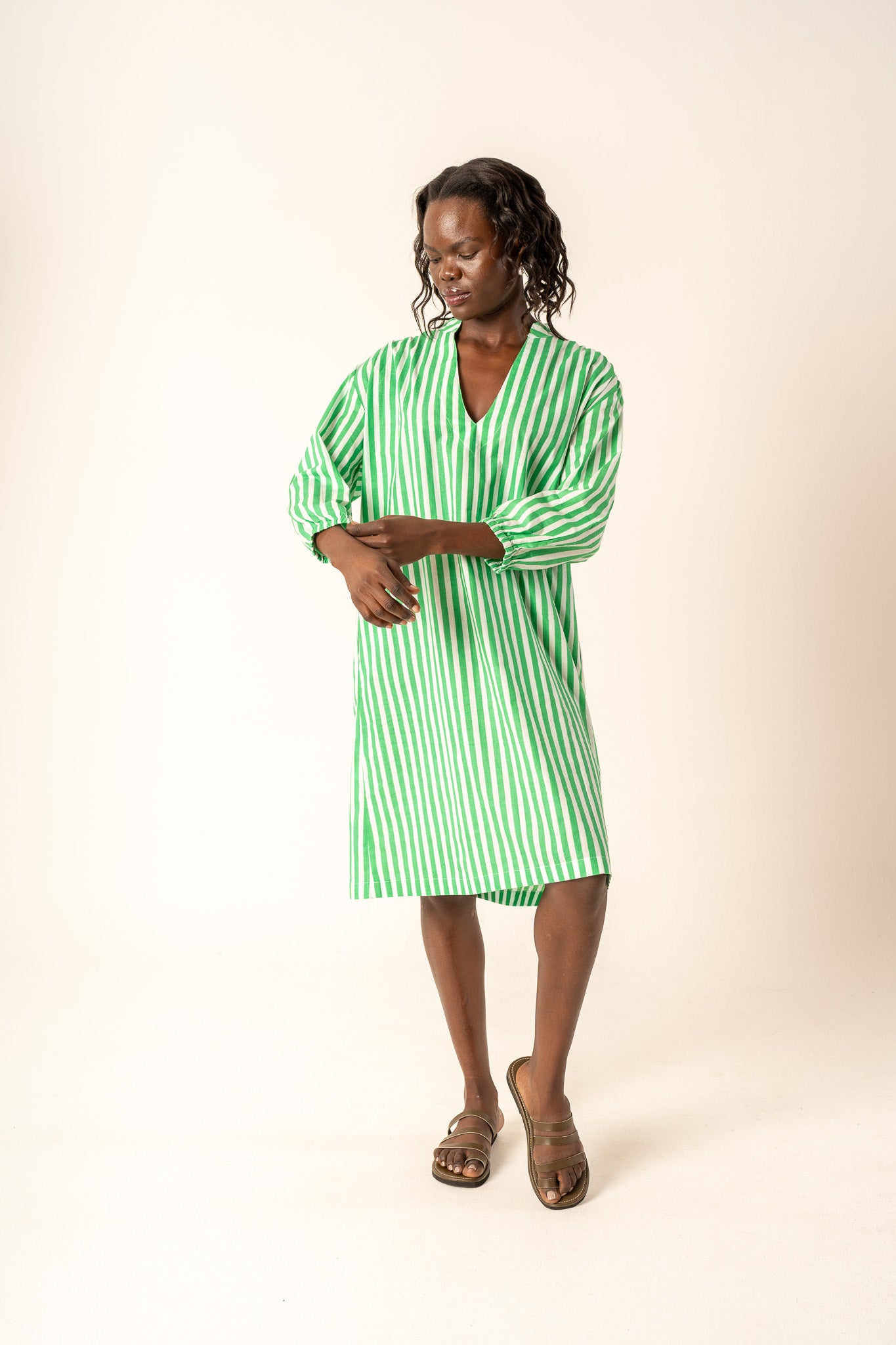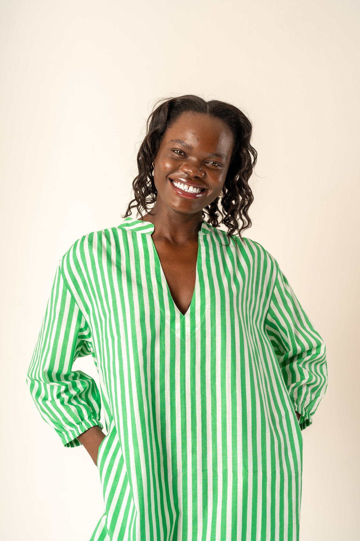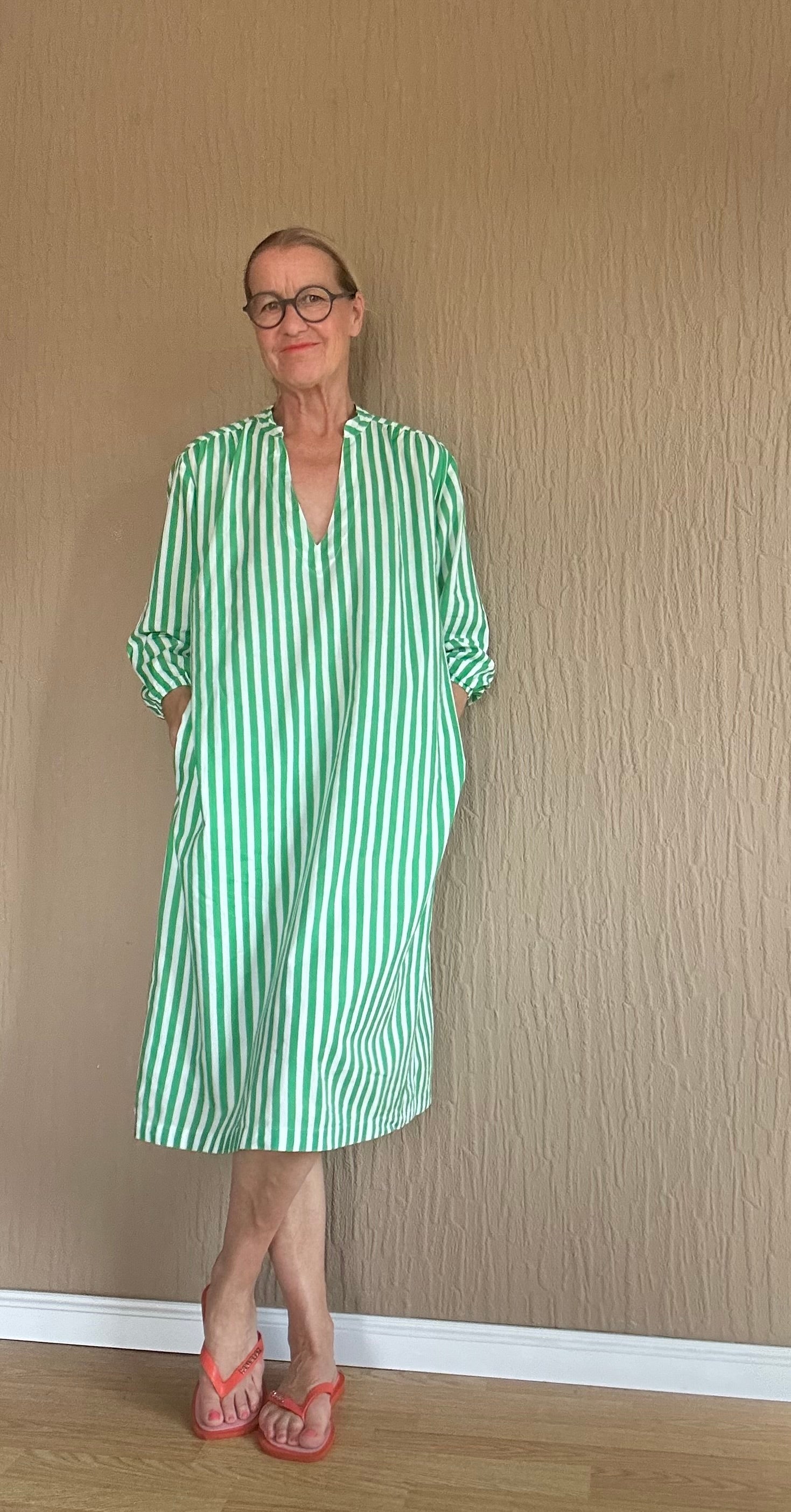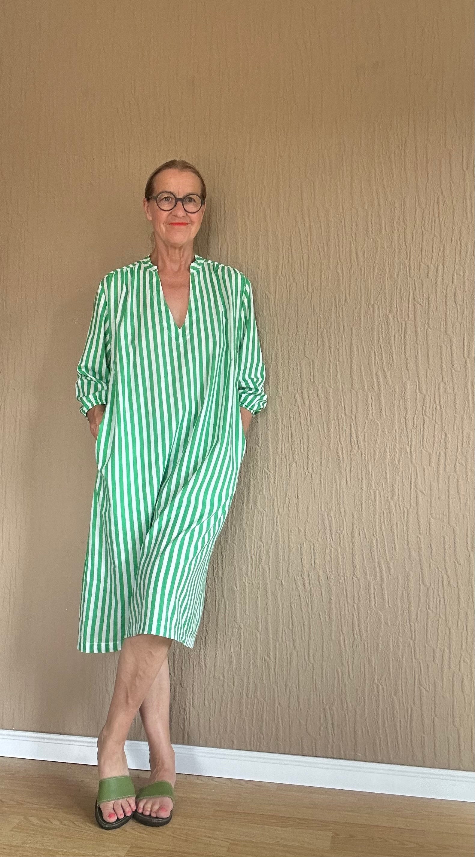 Erleben Sie klassische Eleganz mit unserem schlichten Kleid in angesagtem Streifenmuster. Der tiefe V-Ausschnitt verleiht Ihnen eine feminine Note und lässt Sie strahlen. Perfekt für Freizeit, Urlaub und Strand . Gönnen Sie sich zeitlose Schönheit mit unserem Kleid.