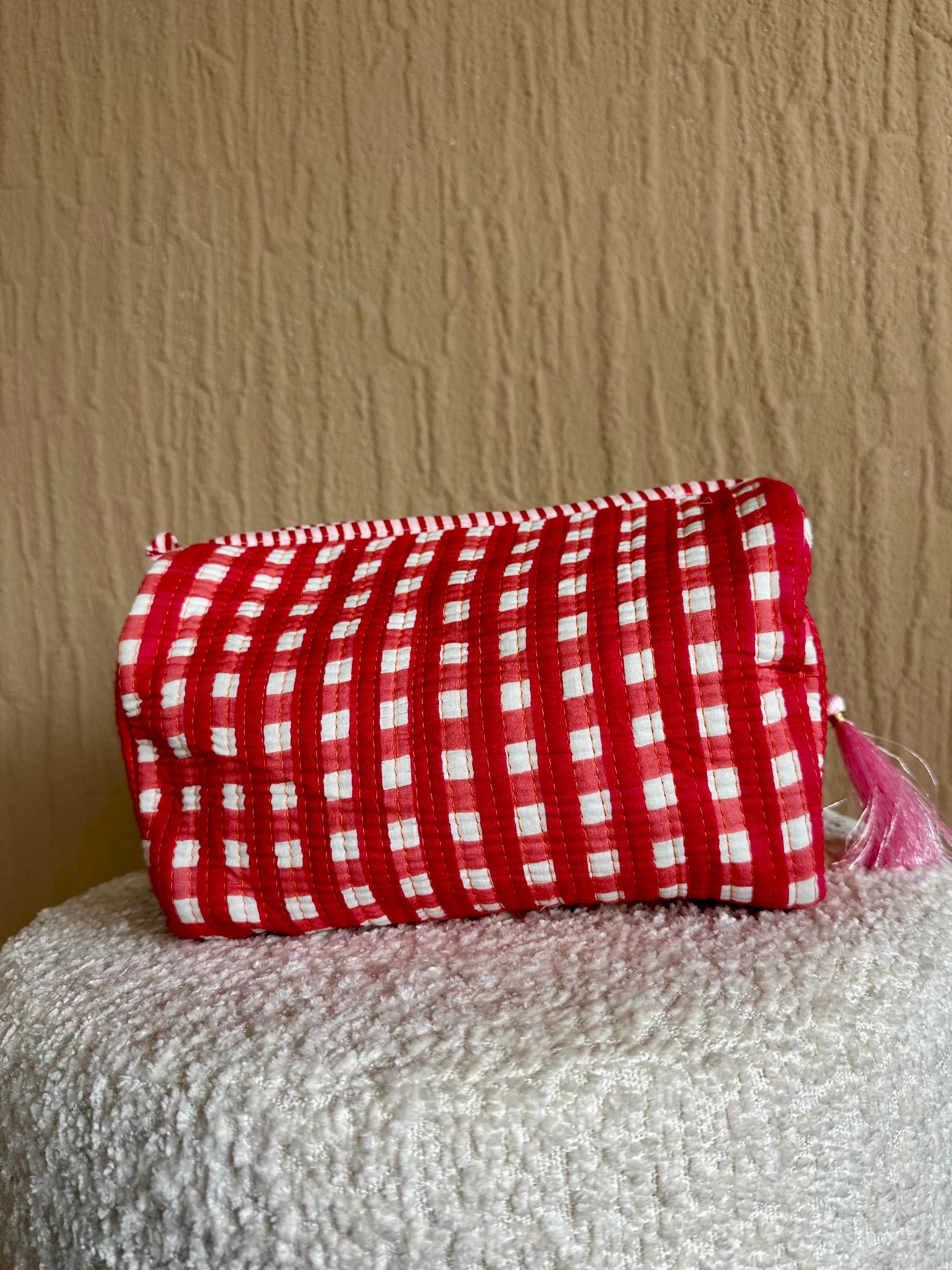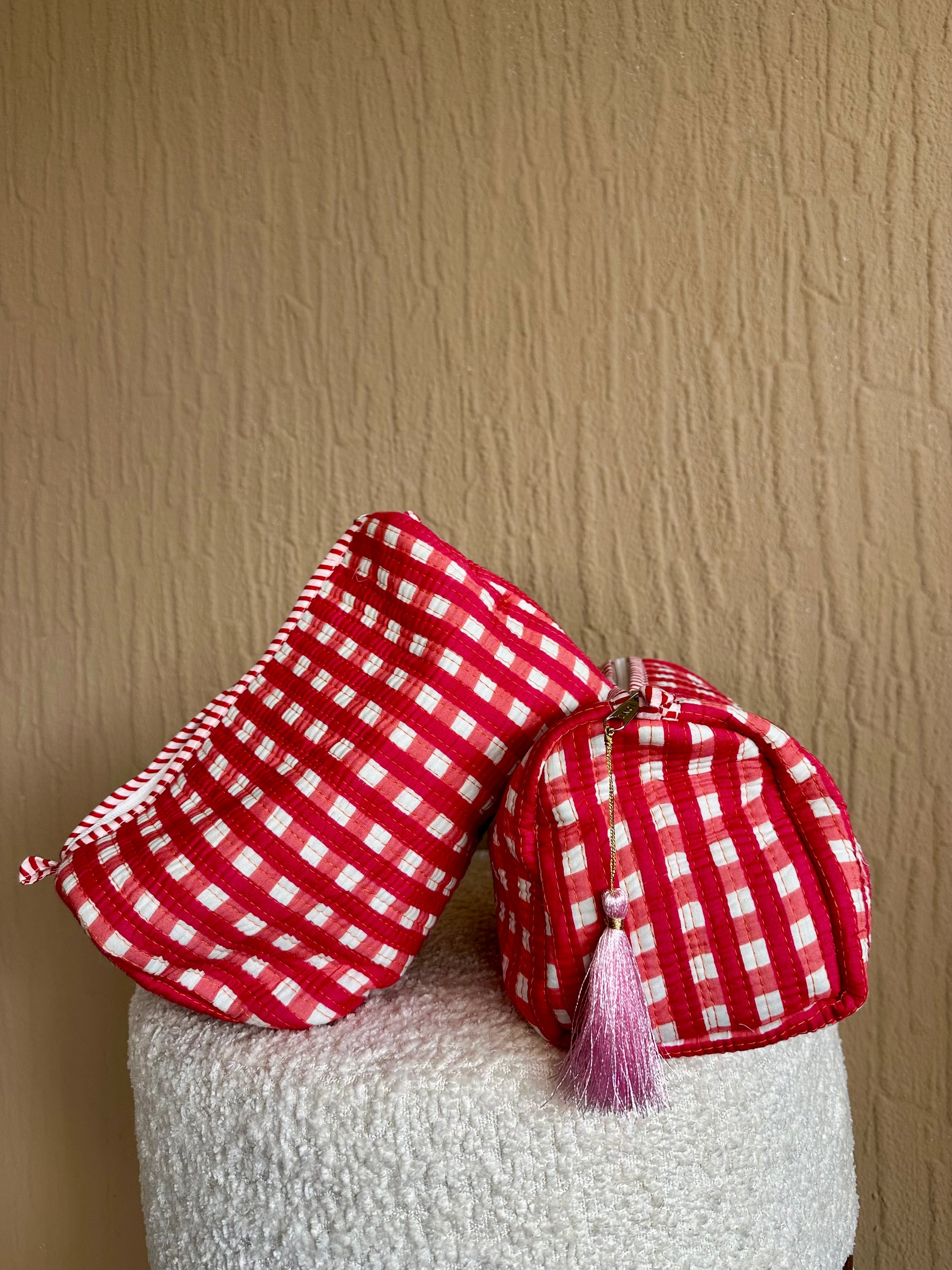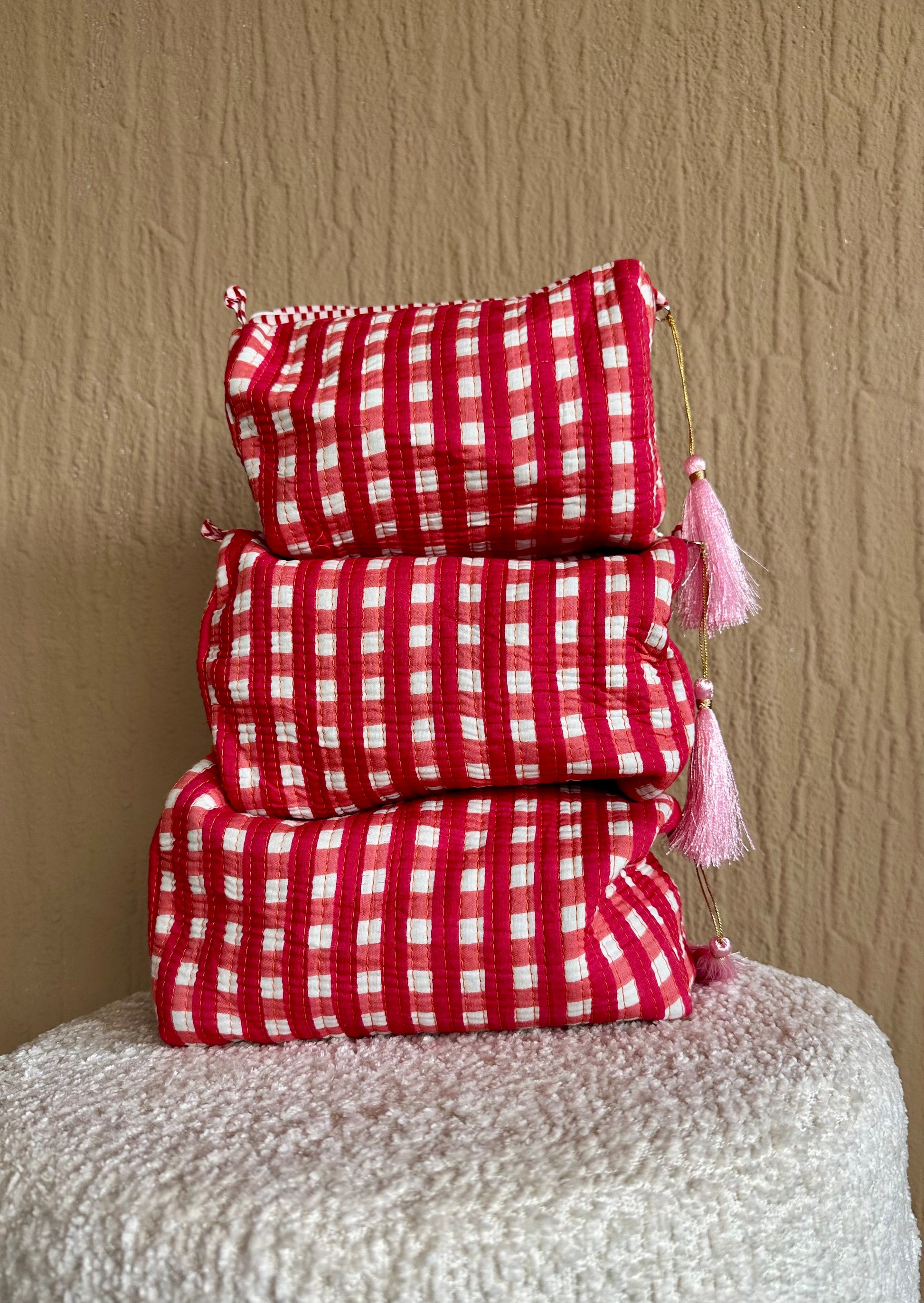 Dieses hübsche Kosmetik Beutel Set besteht aus 3 verschiedenen Größen in einem fröhlichen rot karierten Design. Perfekt für die Aufbewahrung von Kosmetikprodukten auf Reisen oder zu Hause. Mit diesen Beuteln haben Sie immer alles griffbereit und organisiert.