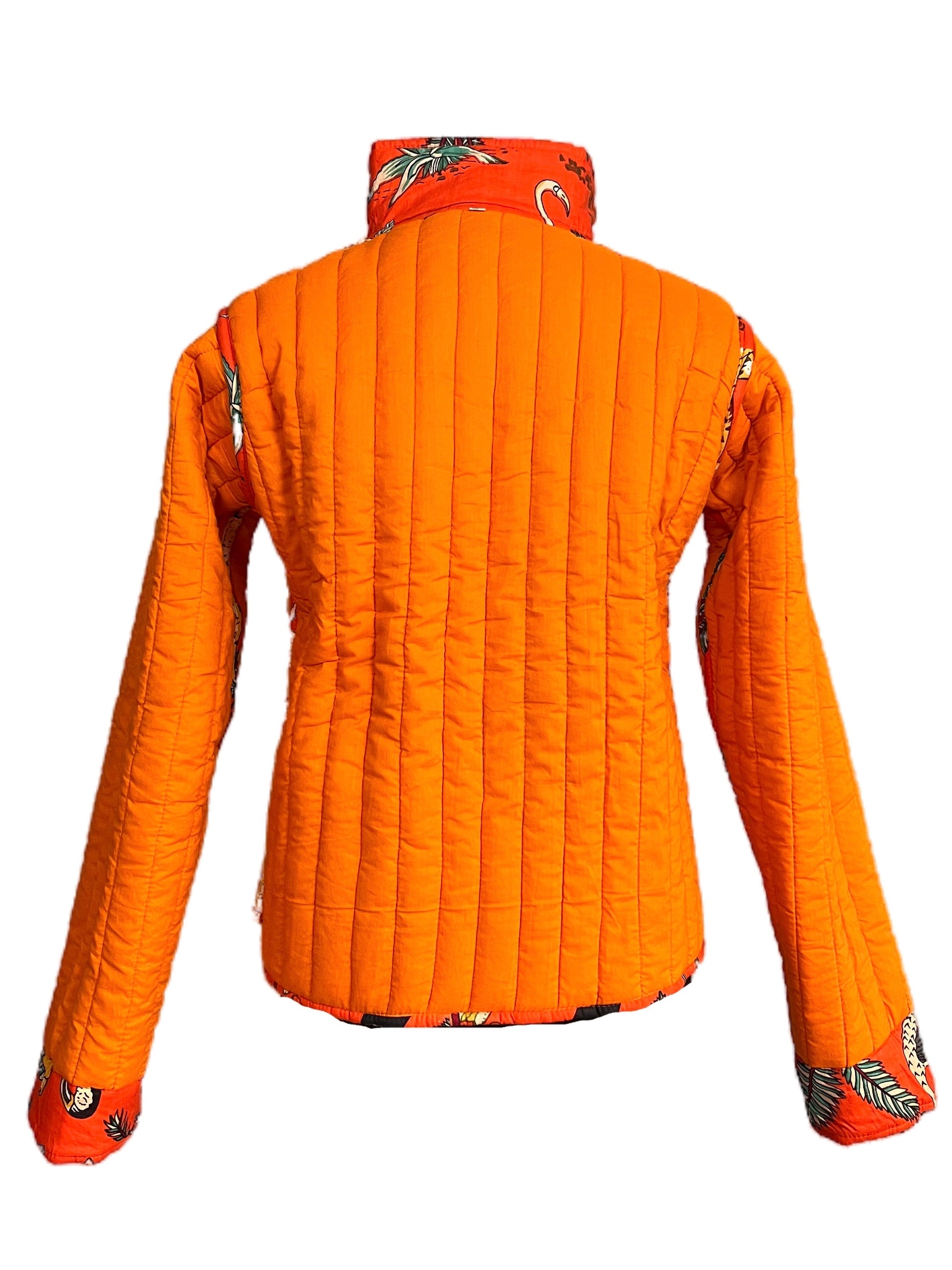 Das lebendige orangefarbene Design wird durch kunstvolle Patchwork-Muster in Ethno-Optik hervorgehoben. Die handbemalten Knöpfe verleihen der Jacke einen individuellen Charakter und machen sie zu einem Unikat. Dank der Wendefunktion können Sie zwei verschiedene Looks genießen, je nach Stimmung und Anlass. Die leichte Füllung aus Synthetik sorgt für angenehme Wärme und einen hohen Tragekomfort.