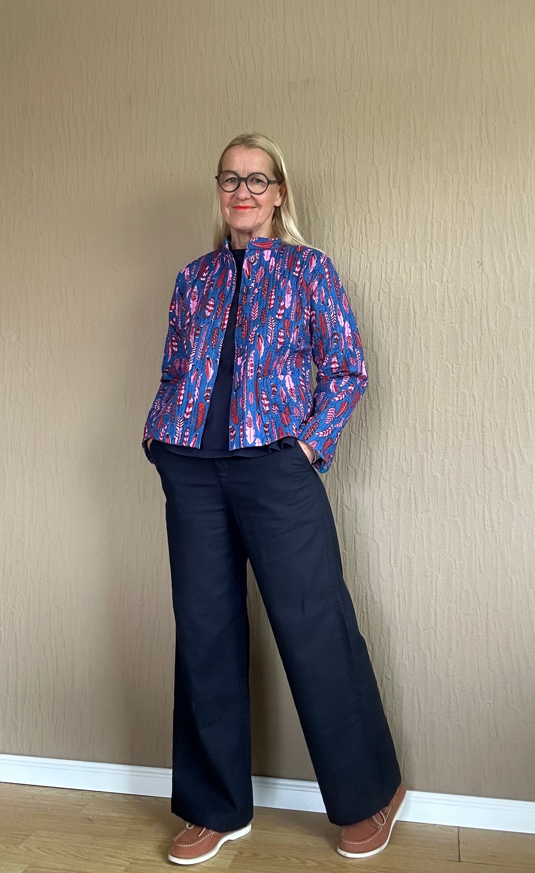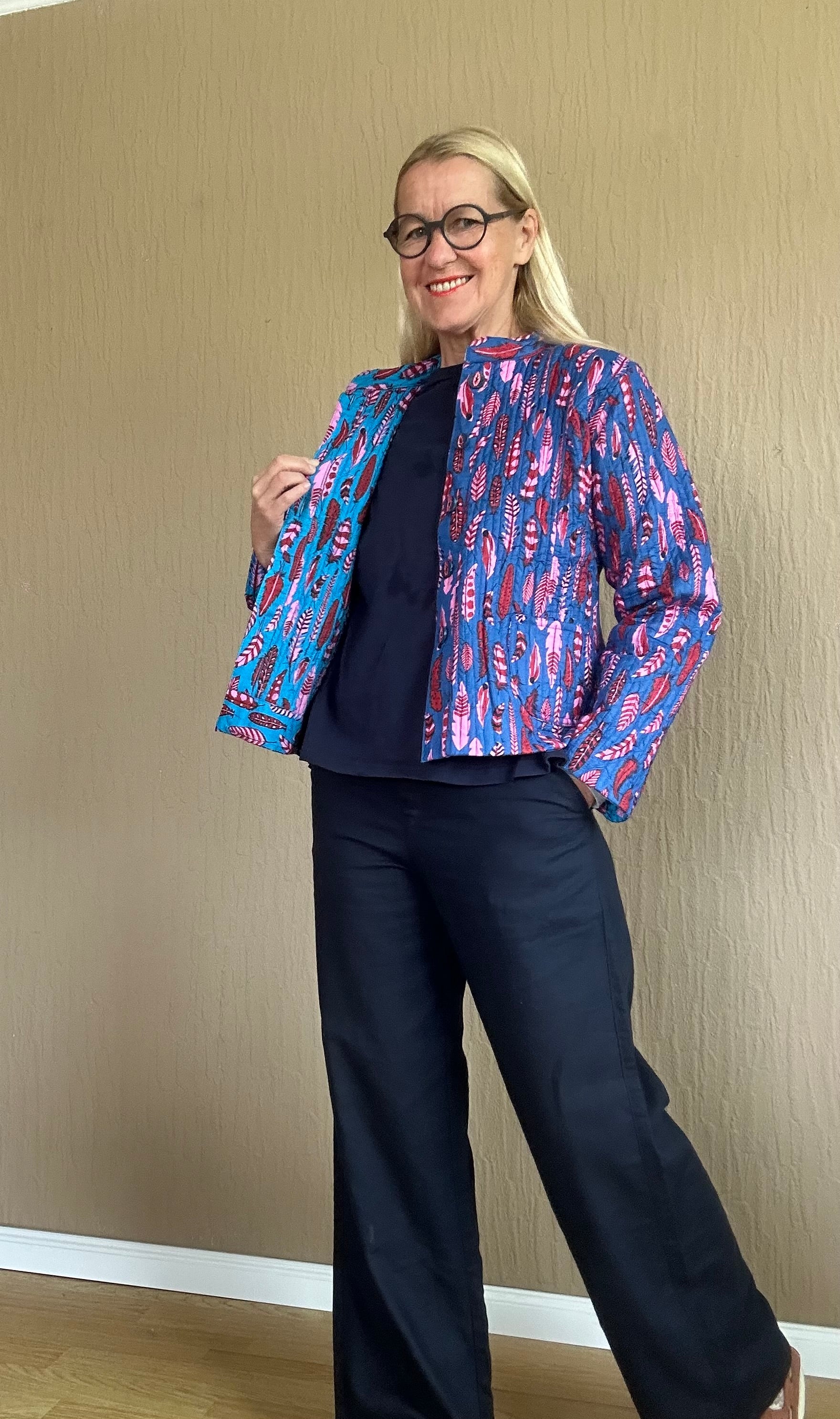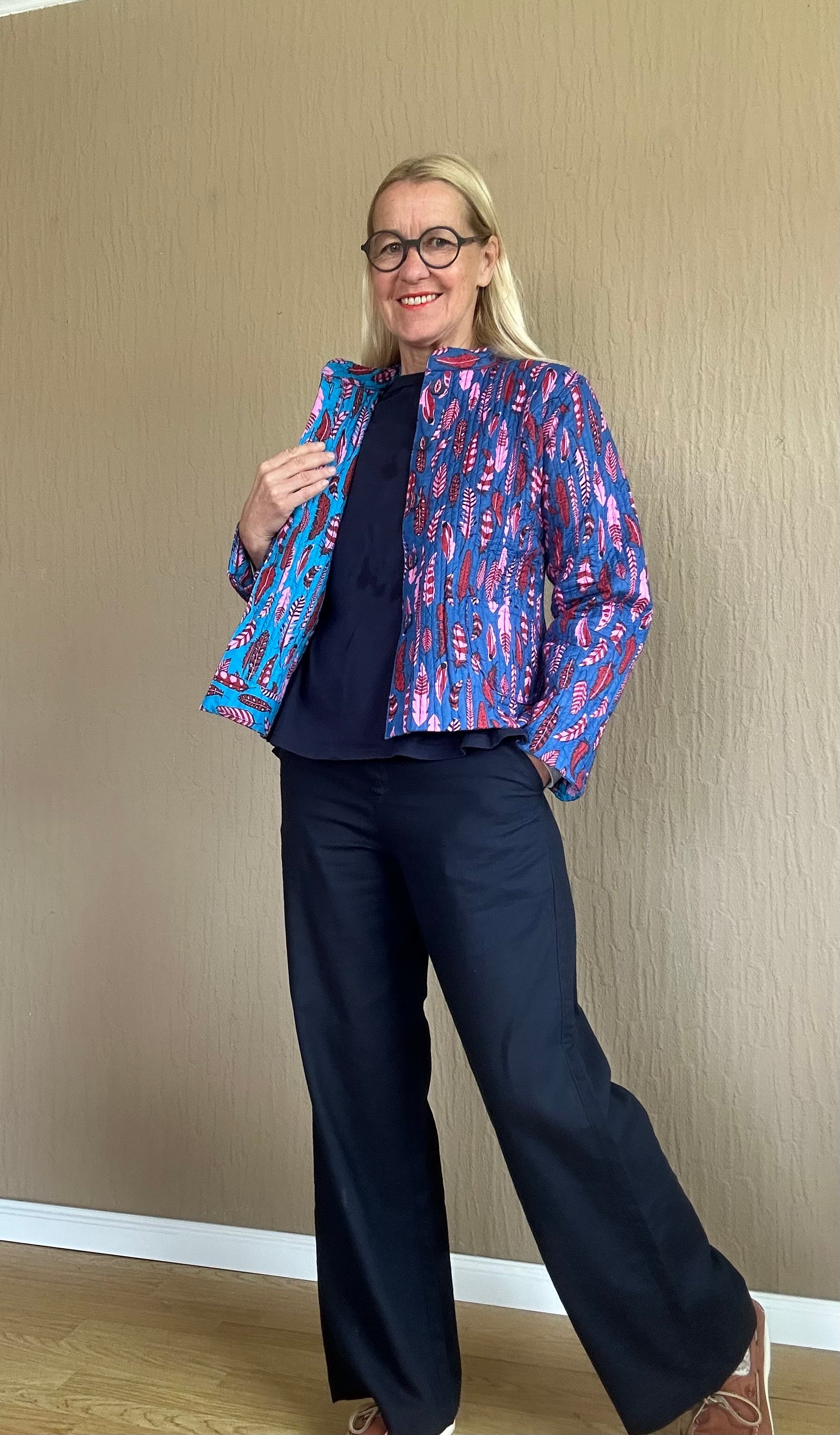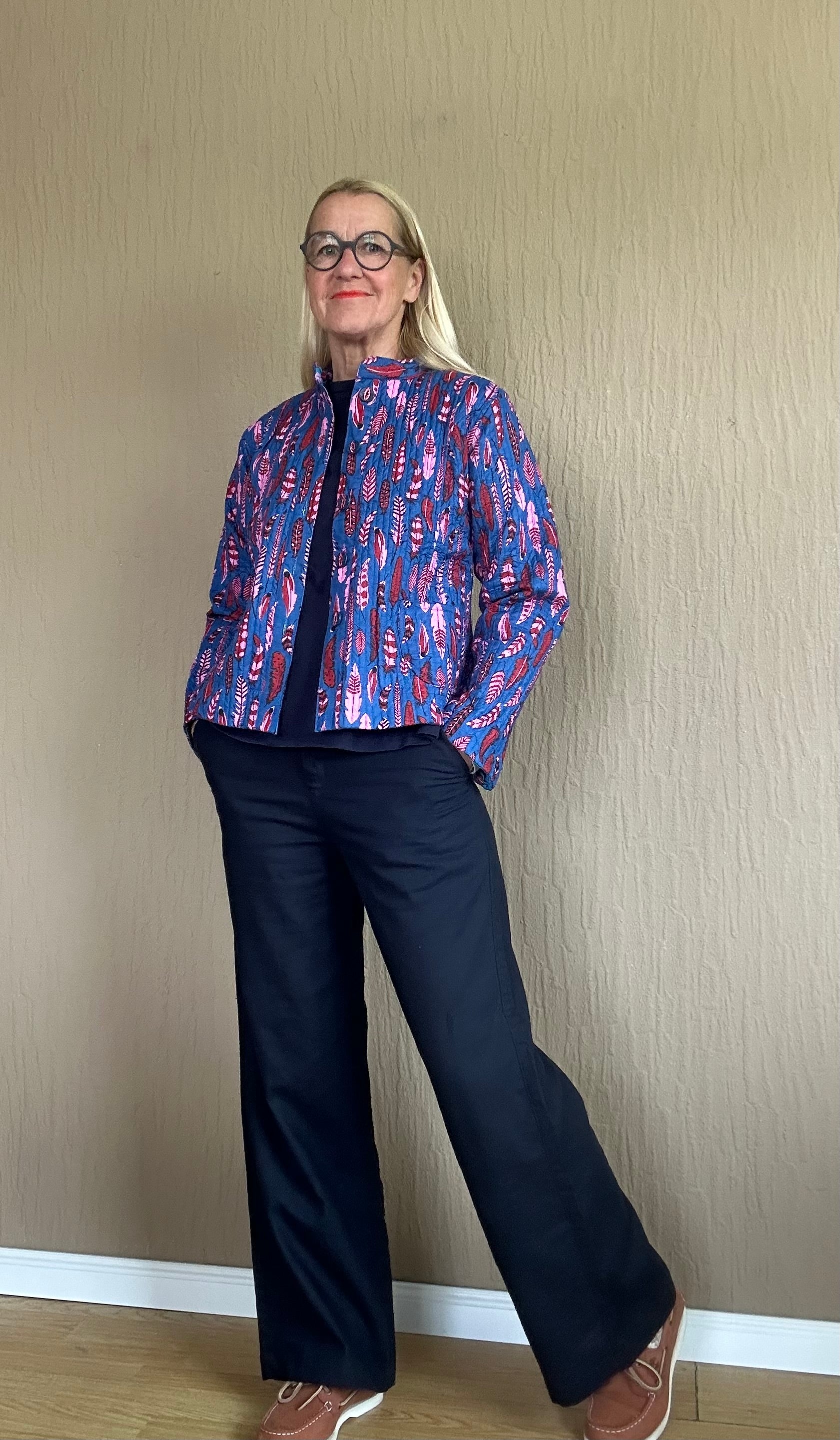 Entdecken Sie die Steppjacke in strahlendem Blau mit pinken Federmuster. Sie ist nicht nur wunderschön tailliert, sondern auch mit weicher Baumwolle gefüttert, damit Sie sich den ganzen Tag über bequem fühlen. Eine perfekte Kombination aus Stil und Komfort für die kältere Jahreszeit.