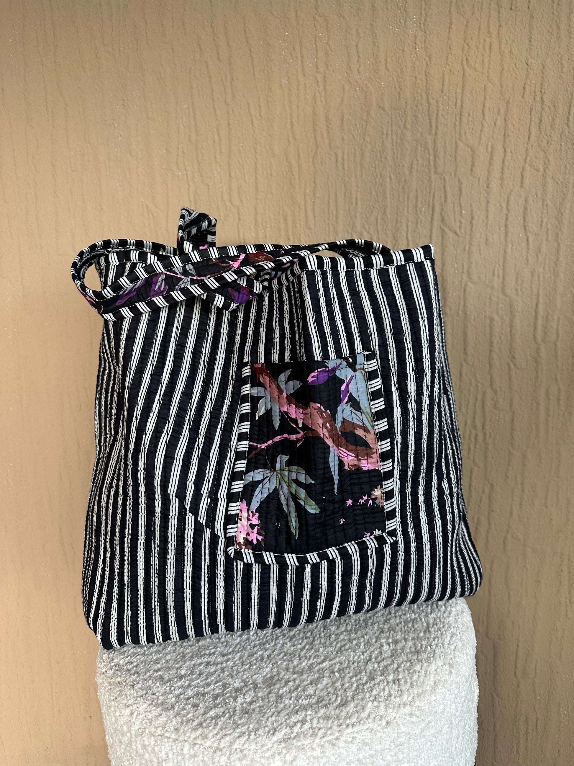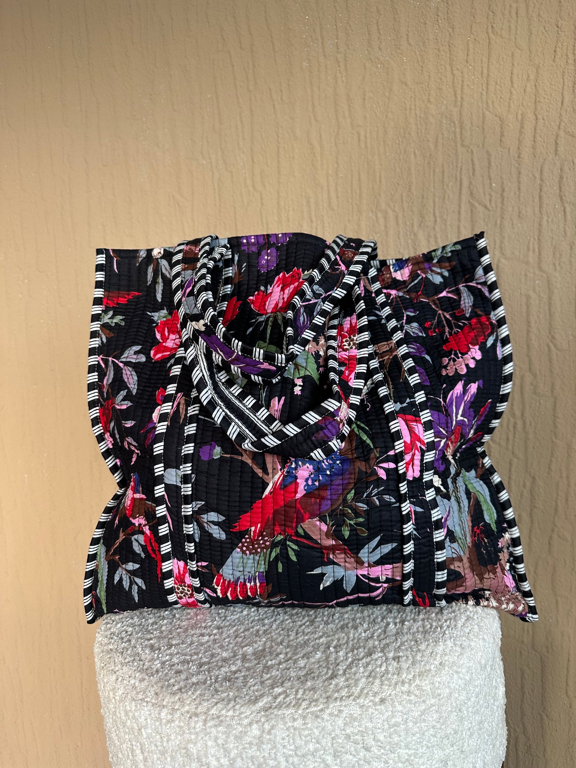 Diese wendbare Tote Tasche ist aus gesteppter Baumwolle gefertigt und verfügt über ein farbenfrohes exotisches Muster auf schwarzem Hintergrund. Perfekt für den täglichen Gebrauch oder als stilvolles Accessoire für besondere Anlässe. Langlebig und vielseitig, um all Ihre Gegenstände sicher und stilvoll zu transportieren.