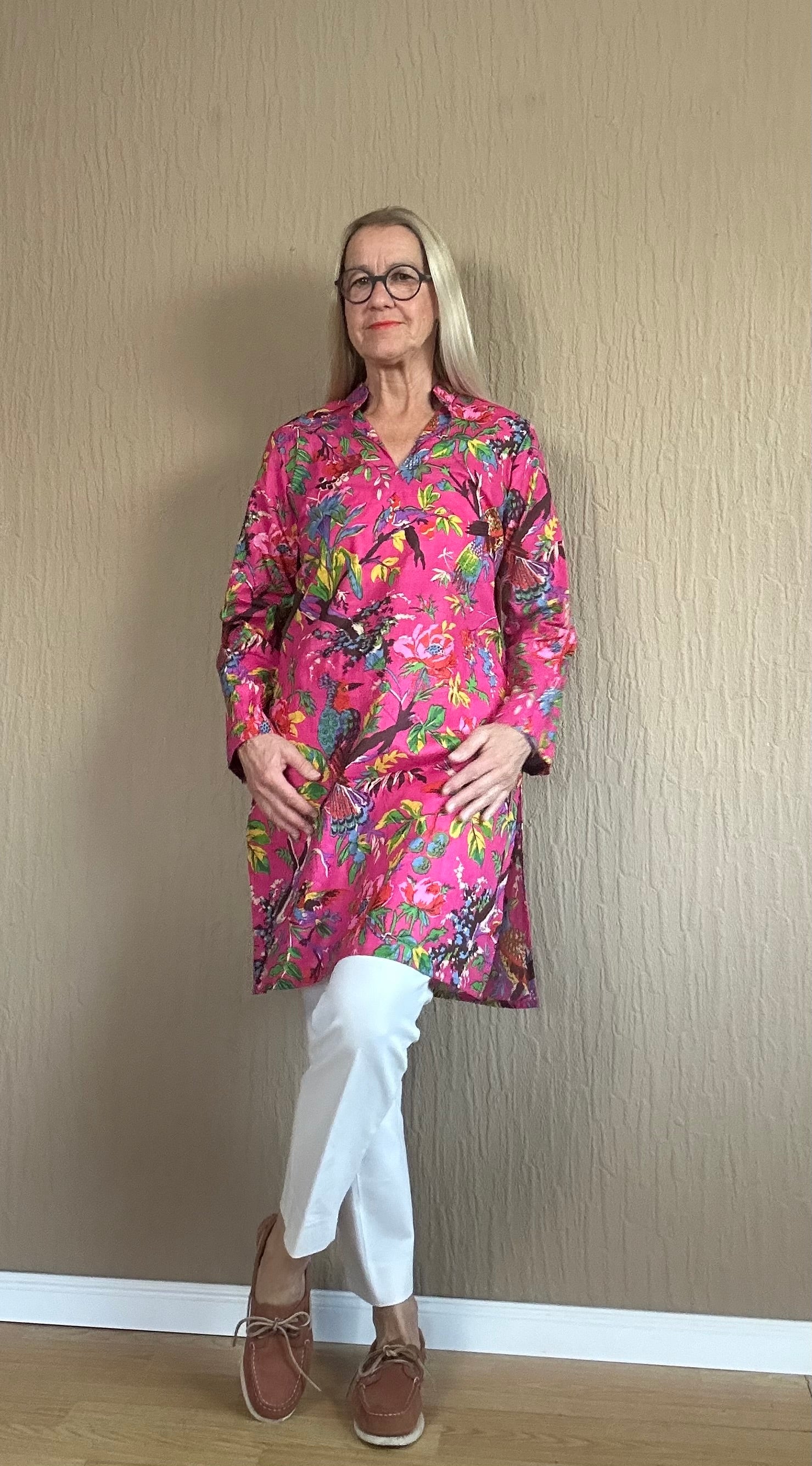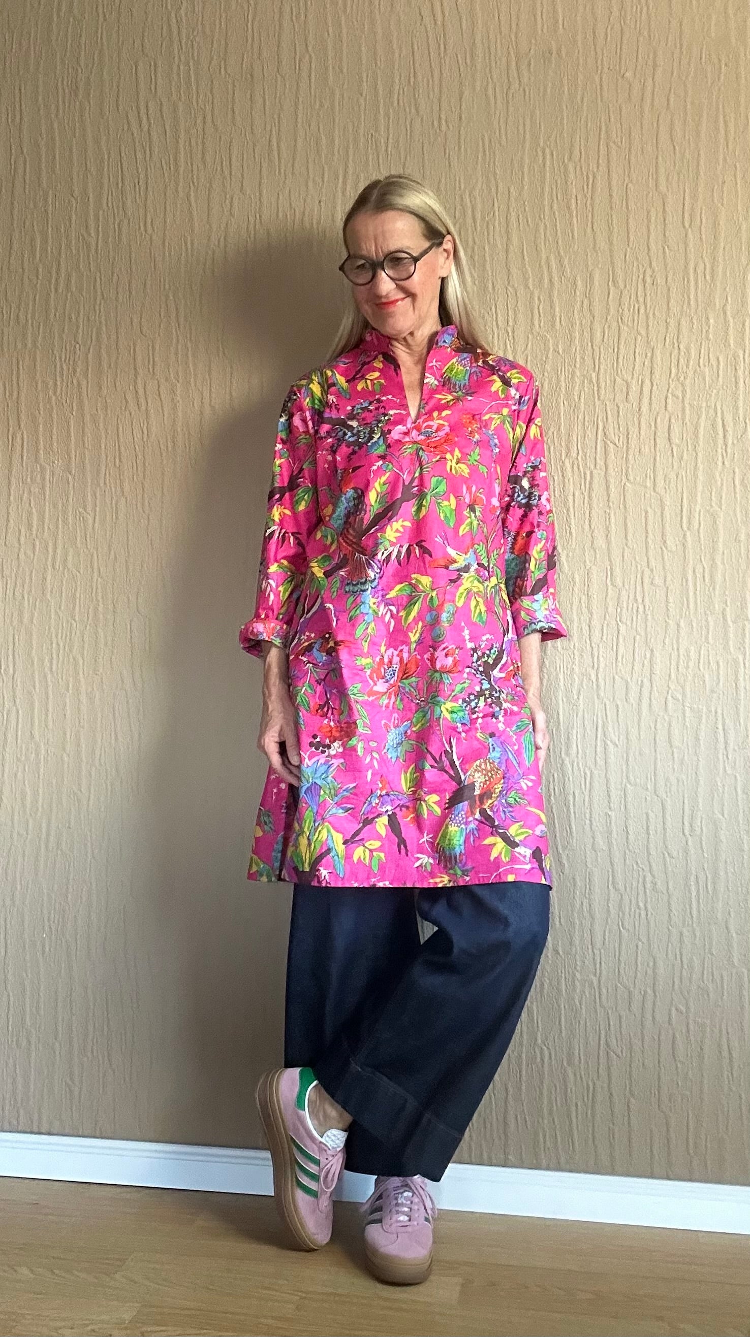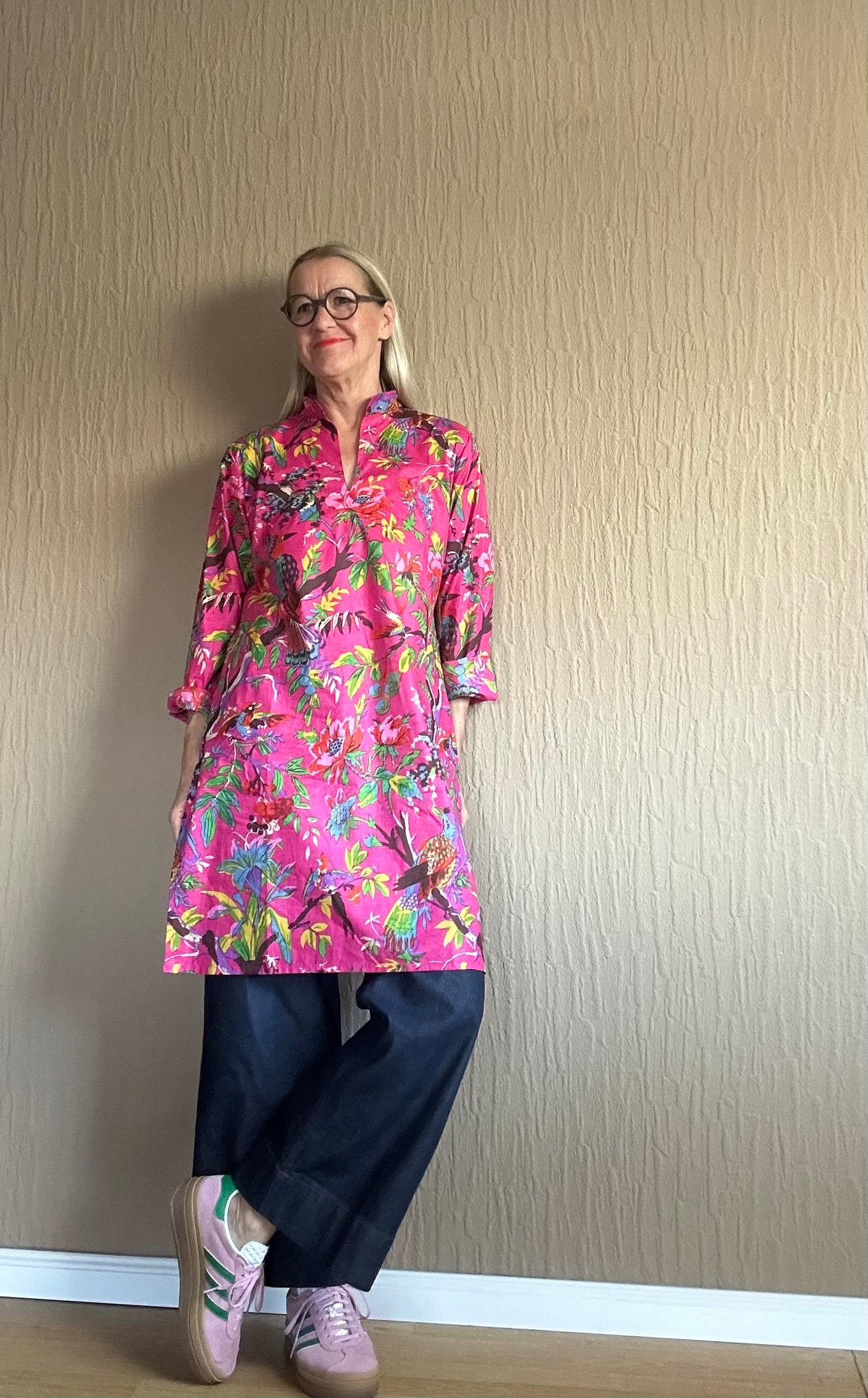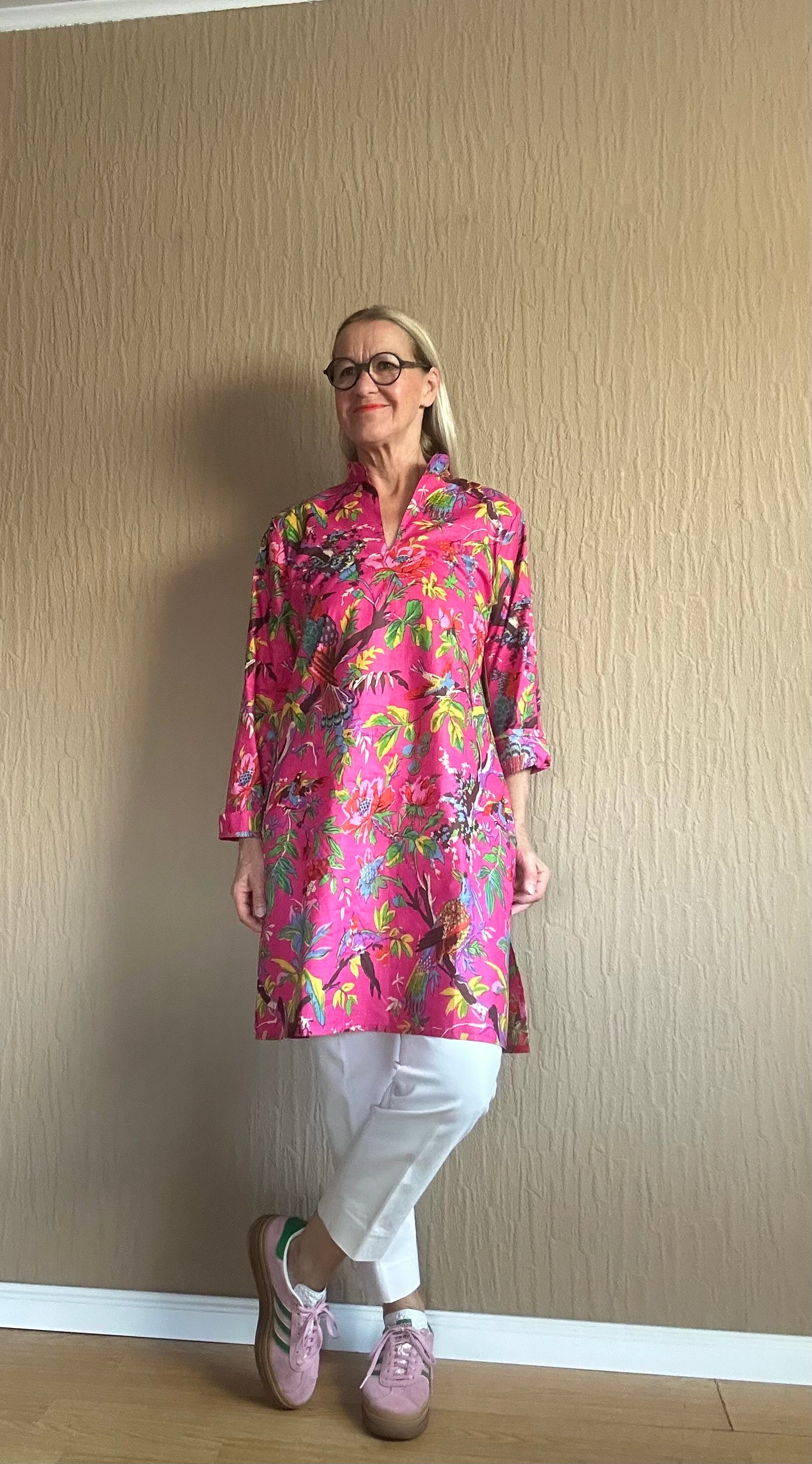 Diese wunderschöne Tunika in Pink ist nicht nur ein Hingucker mit ihrem exotischen Muster, sondern auch äußerst vielseitig. Perfekt für jeden Anlass, sei es am Strand oder in der Stadt, verleiht sie jedem Outfit das gewisse Etwas. Holen Sie sich jetzt dieses Must-Have Kleidungsstück für Ihren Kleiderschrank!