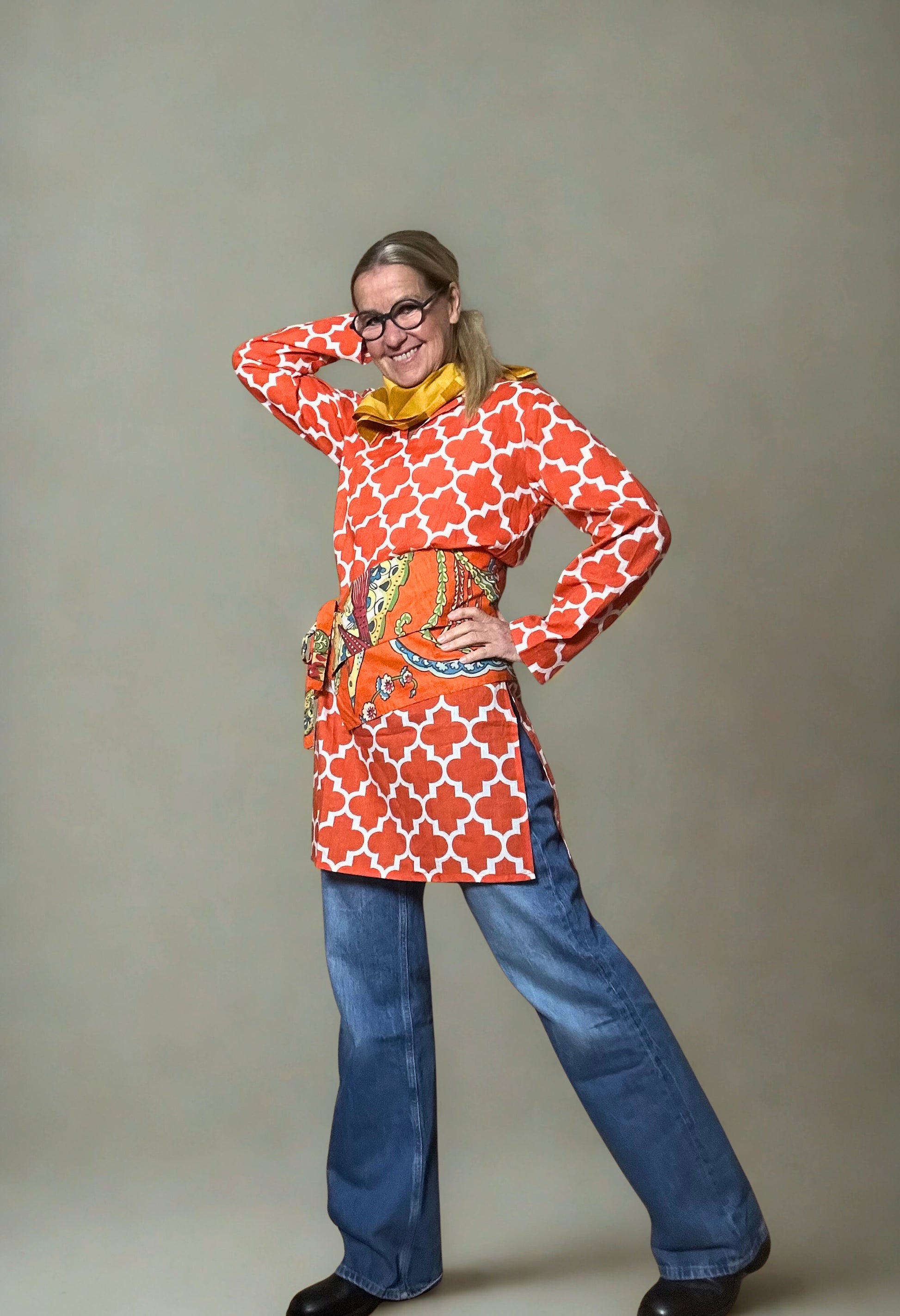 Diese Tunika präsentiert ein auffälliges graphisches Muster in Orange, das sowohl visuell ansprechend als auch vielseitig einsetzbar ist. Das Design ermöglicht es, die Tunika leicht mit verschiedenen Outfits zu kombinieren. Die Farbgebung könnte die Stimmung heben, da orange häufig mit Energie und Wärme assoziiert wird.